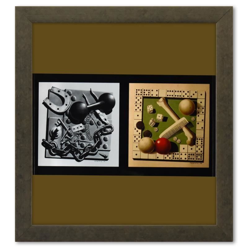 "Etude De Matiere (1,4) et Etude De Matiere (2,3) de la serie Graphismes 1 (Diptych)" is a set of heliogravure prints on paper, published in 1977, by Victor Vasarely (1908-1997). These pieces come custom framed, with a letter of authenticity and with a 1976 Vasarely paperback. Measures approx. 12" x 13" (frame), 9" x 5" (image).