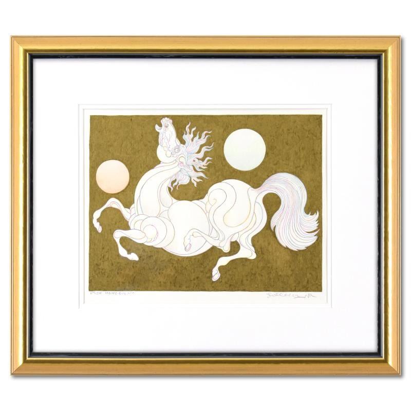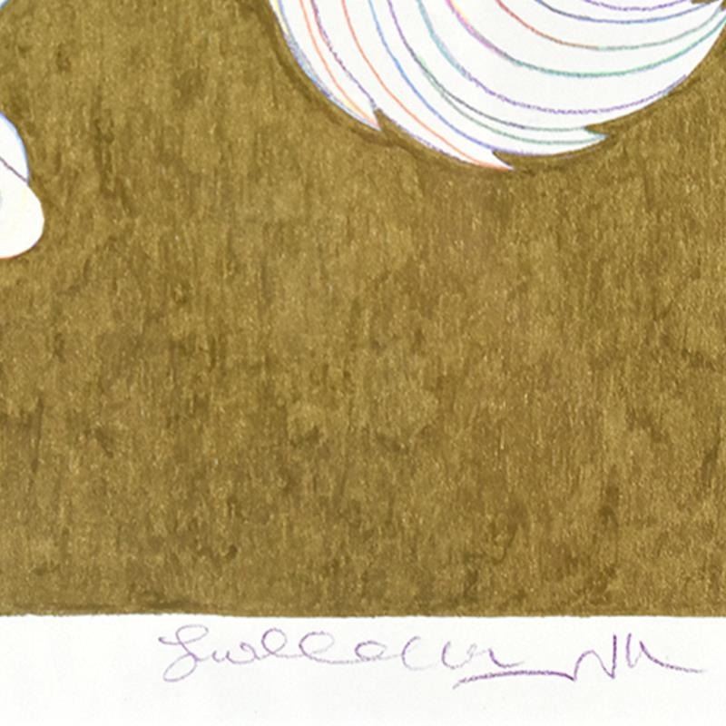 "Etude MGMO" is an original hand colored drawing on paper with hand laid gold leaf by Guillaume Azoulay, hand signed by the artist. This piece comes custom framed. Includes Letter of Authenticity. Measures approx. 22" x 19" (frame); 12.5" x 9.5" (image).