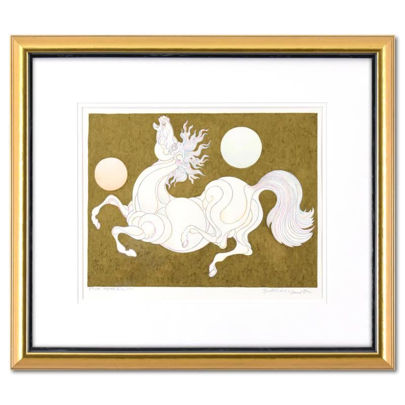 "Etude MGMO" is an original hand colored drawing on paper with hand laid gold leaf by Guillaume Azoulay, hand signed by the artist. This piece comes custom framed. Includes Letter of Authenticity. Measures approx. 22" x 19" (frame); 12.5" x 9.5" (image).