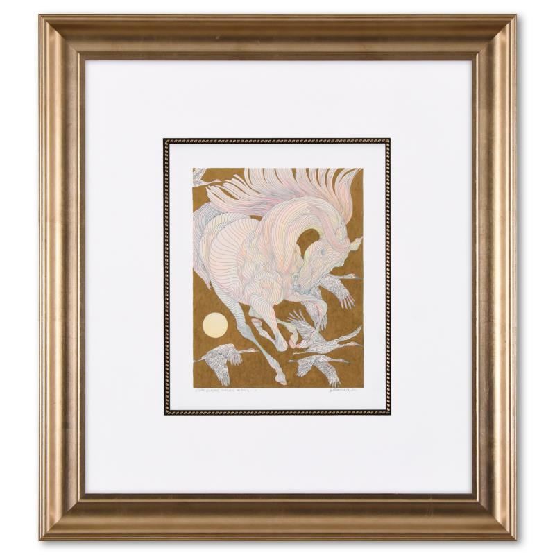 "Etude Quatre Grues" is an original hand colored drawing on paper with hand laid gold leaf by Guillaume Azoulay, hand signed by the artist. This piece comes custom framed. Includes Letter of Authenticity. Measures approx. 23" x 25.5" (frame); 8" x 11" (image).