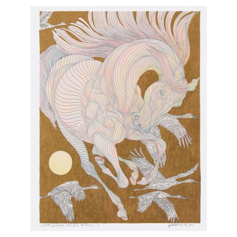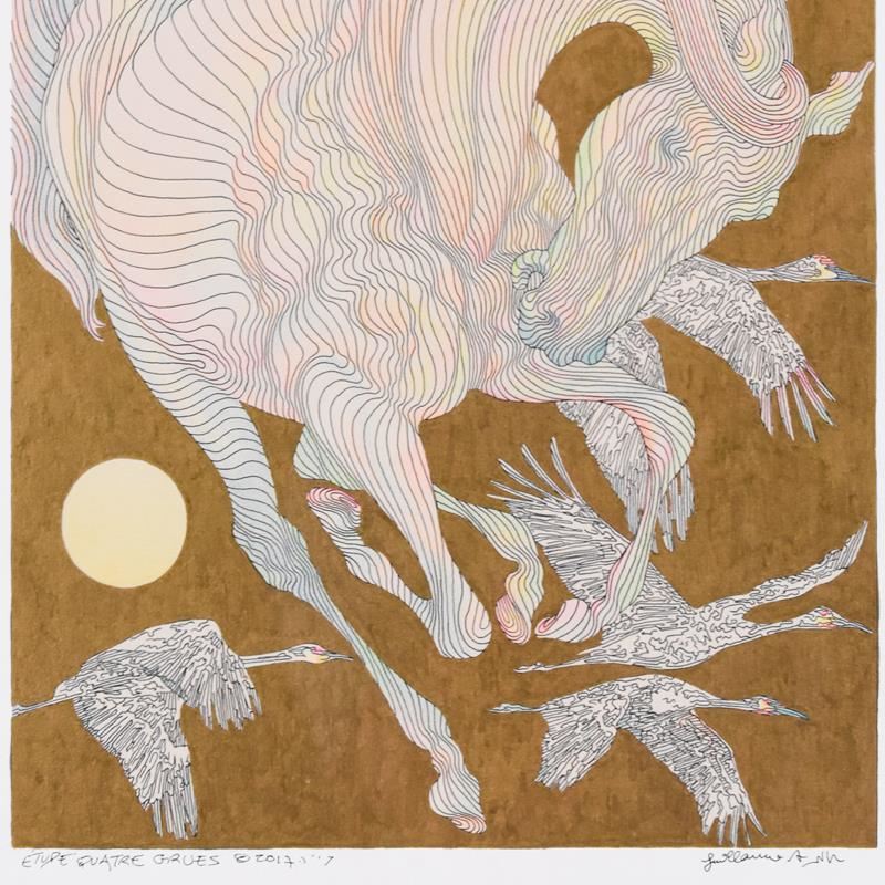 "Etude Quatre Grues" is an original hand colored drawing on paper with hand laid gold leaf by Guillaume Azoulay, hand signed by the artist. This piece comes custom framed. Includes Letter of Authenticity. Measures approx. 23" x 25.5" (frame); 8" x 11" (image).