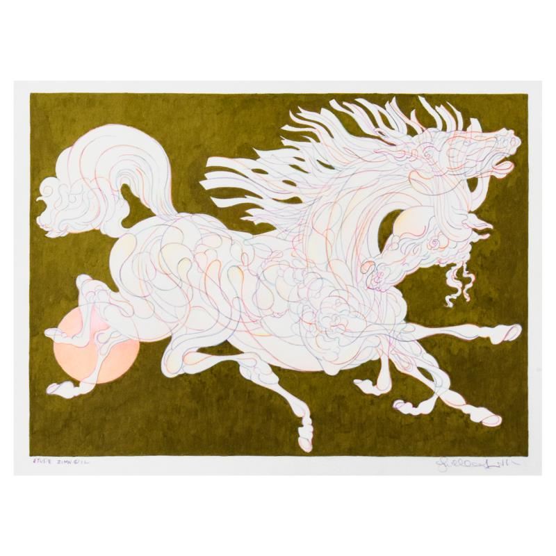 "Etude ZIMN" is an original hand colored drawing on paper with hand laid gold leaf by Guillaume Azoulay, hand signed by the artist. This piece comes custom framed. Includes Letter of Authenticity. Measures approx. 27" x 23" (frame); 15" x 11" (image).