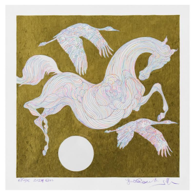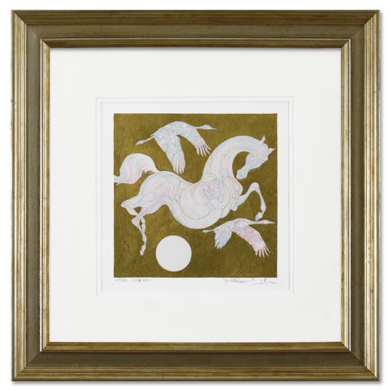 "Etude ZOZM" is an original hand colored drawing on paper with hand laid gold leaf by Guillaume Azoulay, hand signed by the artist. This piece comes custom framed. Includes Letter of Authenticity. Measures approx. 19.5" x 20" (frame); 8.5" x 8.5" (image).