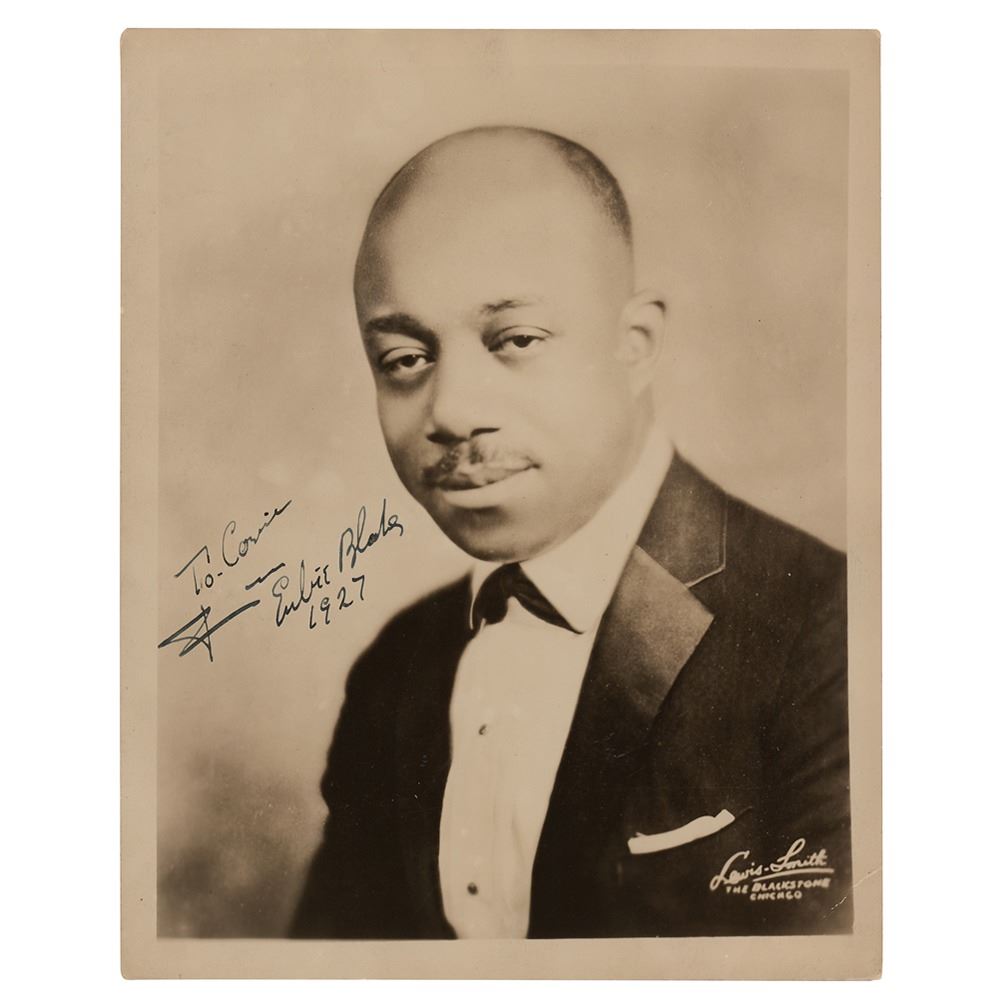 Vintage matte-finish 8 x 10 photo of the great ragtime and jazz pianist by Lewis-Smith of Chicago, signed and inscribed in fountain pen, "To Corine, from Eubie Blake, 1927.†In fine condition, with a crease to the lower left corner.