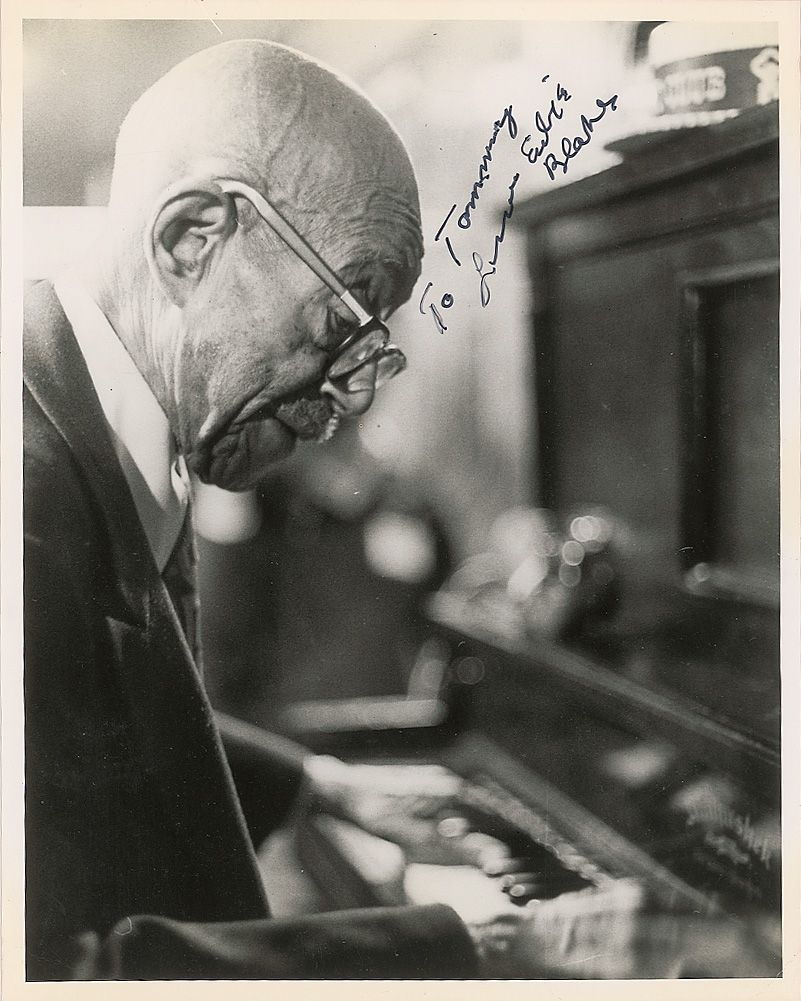 Glossy 8 x 10 photo of Blake playing the piano, signed and inscribed in black felt tip “To Tommy, from Eubie Blake.” Toning to the top and light scattered creases and impressions, otherwise fine condition.