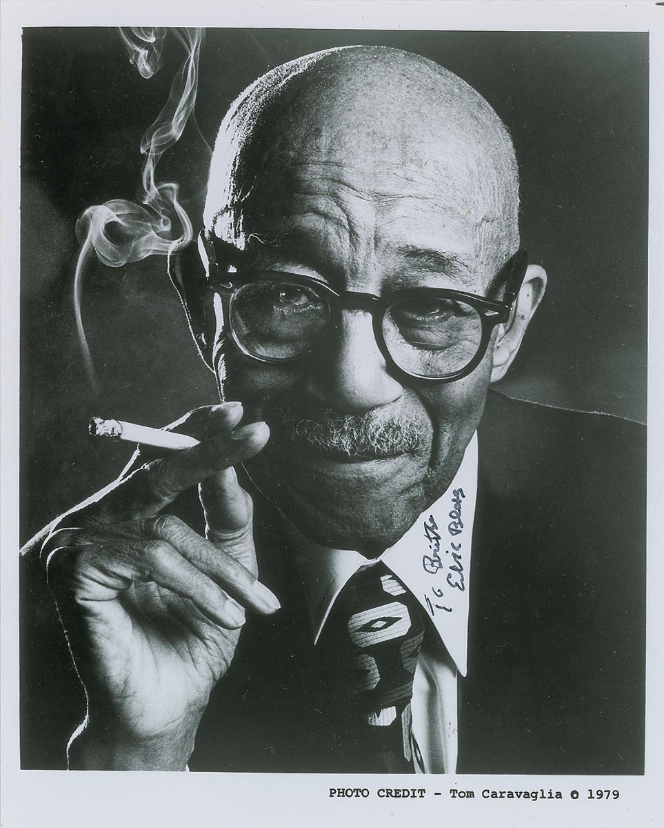 Circa 1979 glossy 8 x 9.75 photo of Eubie Blake smoking a cigarette, vertically signed and inscribed on his collar in black felt tip. In fine condition.