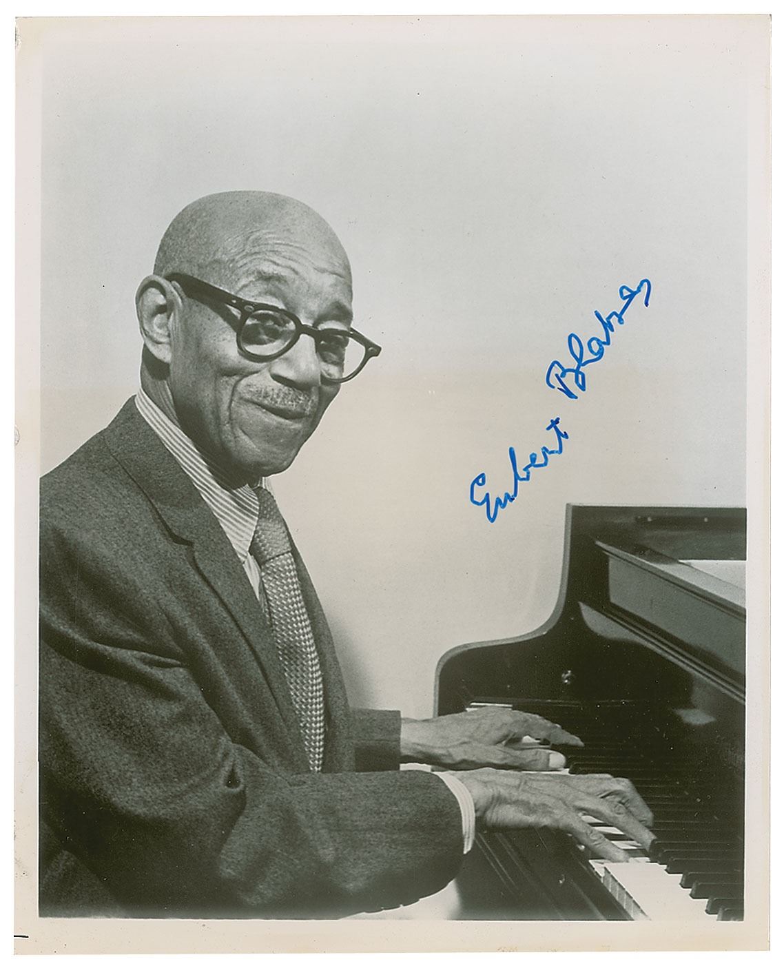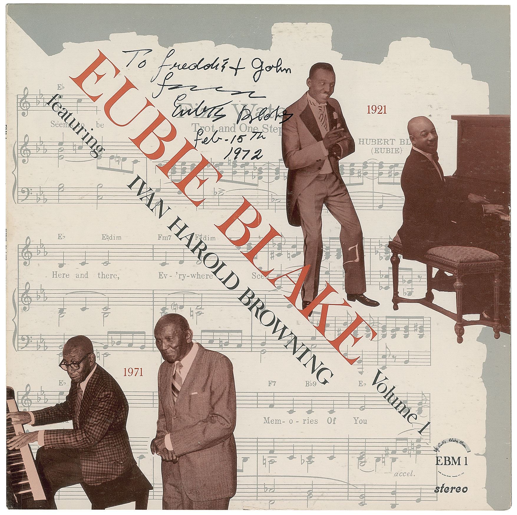 Two items: a glossy 8 x 10 photo of Blake seated at the piano, signed in blue felt tip, "Eubie Blake"; and a Eubie Blake featuring Ivan Harold Browning Volume I album, signed and inscribed on the front cover in black felt tip, "To Freddie & John, from, Eubie Blake, Feb. 15th, 1972." In overall fine condition. The record is included.