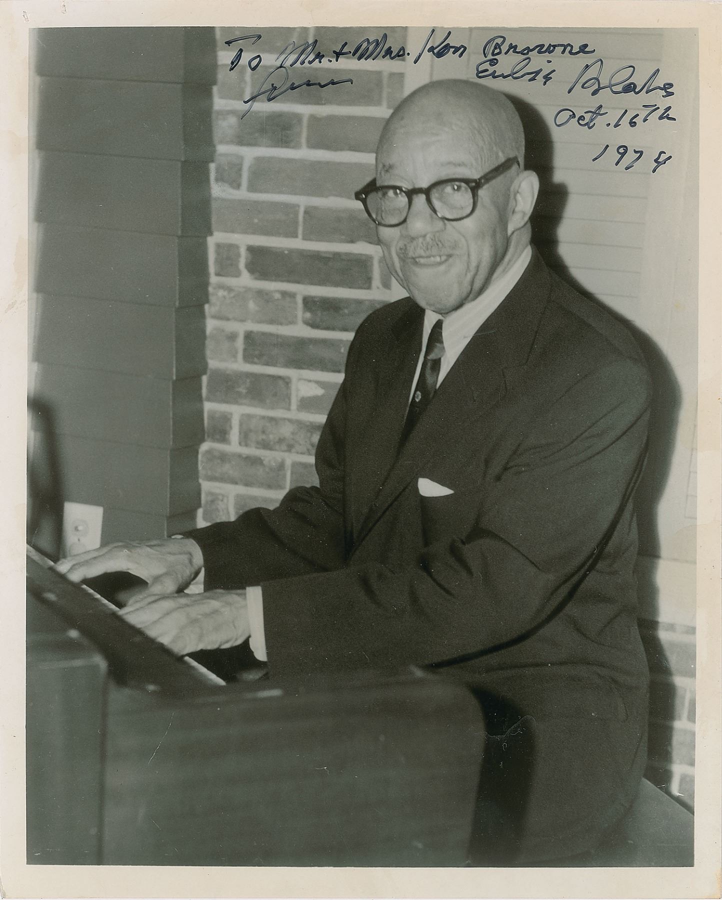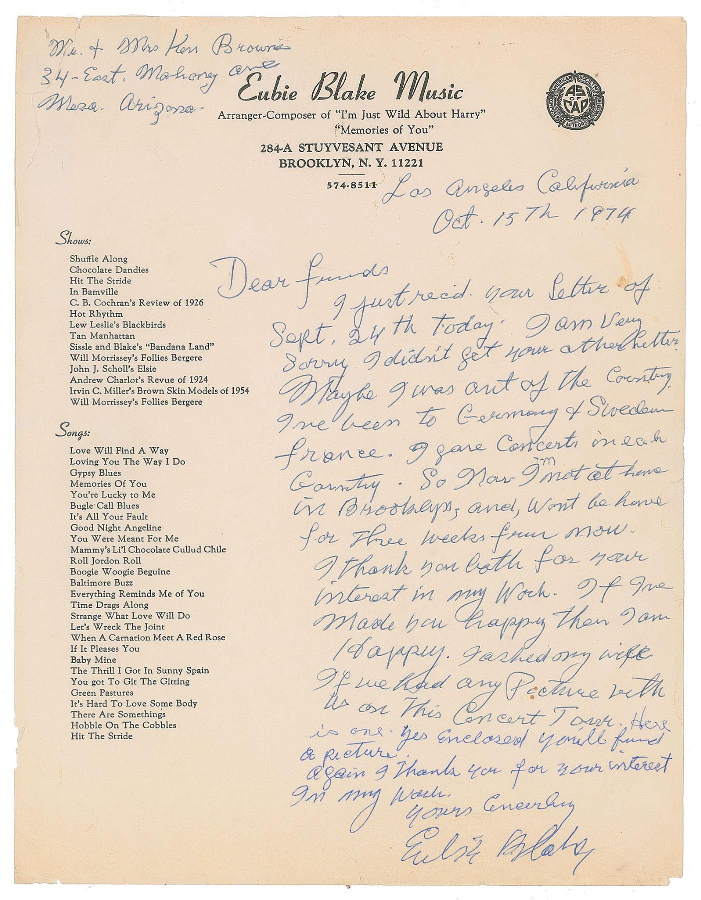 Two items: an ALS, one page, 8.5 x 11, Eubie Blake Music letterhead, October 15, 1974, addressed to Mr. and Mrs. Ken Browne, in part: "I am very sorry I didn't get your other letter. Maybe I was out of the country. I've been to Germany & Sweden, France. I gave concerts in each country. So now I'm not at home in Brooklyn, and won't be home for three weeks…I asked my wife if we had any pictures with us on this concert tour. Here is one"; and a vintage glossy 8 x 10 half-length photo of Blake seated and smiling at his piano, signed and inscribed in black felt tip, "To Mr. & Mrs. Ken Browne, from Eubie Blake, Oct. 16th, 1974." In overall very good condition, with emulsion irregularity to the photo, and some wrinkling to the letter.