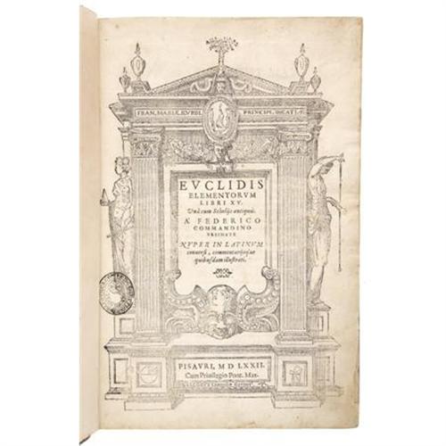 <B>Euclidis Euclid , </B></I><B><I>Elementorum Libri XV. Una Cum Scholijs Antiquis,</B></I></B></I> translated by Federico Commandino Urbinate Nuper in Latin (Pisa: Comillo Franceschini, 1572), first edition, 256 pages, illustrations, vellum, bound in leather with gold lettering and decorations on spine, folio (8.75” x 12.5”). Federico, Commandino Urbinate, was the first scholar to translate this ancient work of Euclid (c. 323-283 B.C.), the foremost mathematician of the prestigious Alexandrian Academy, from the original Greek into Latin. One of the most historically significant books ever written, <I>Elements</B></I> is the oldest mathematical text still in use today, and this translation is considered the best. The study of Euclid’s monumental work, written 23 centuries ago, has perhaps been eclipsed only by that of the Bible. One bookplate has been pasted over an earlier one inside the front cover. This rare historical treasure is in good condition (remarkable for its age of 435 years) with moderate, very old, damp staining on the paper and moderate staining and wear on the binding.<BR><BR><b>Shipping:</b> Books & Catalogs (<a target="_blank" href="http://www.heritageauctions.com/common/shipping.php">view shipping information</a>)