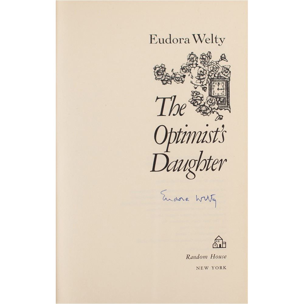 Signed book: The Optimist's Daughter. First edition. NY: Random House, 1972. Hardcover with dust jacket, 5.75 x 8.5, 180 pages. Signed on the title page in ink by Eudora Welty. In fine condition.