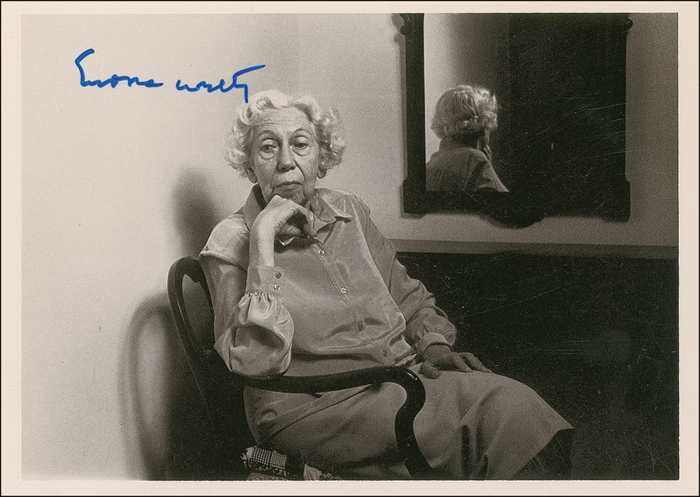 Thoughtful 6 x 4 postcard photo, signed in blue felt tip, “Eudora Welty.” In fine condition, with a few trivial creases and some surface marks.