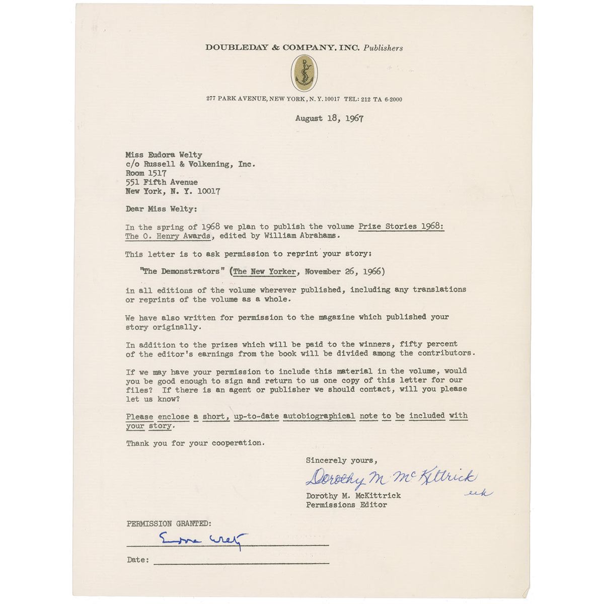 DS, one page, 8.5 x 11, August 18, 1967. Agreement between Doubleday and Company and Welty for the reprinting of her story The Demonstrators, in “the volume Prize Stories 1968: The O. Henry Awards.” Signed at the bottom by Welty granting permission. Staple hole to top left, and a vertical fold along left edge, otherwise fine condition.
