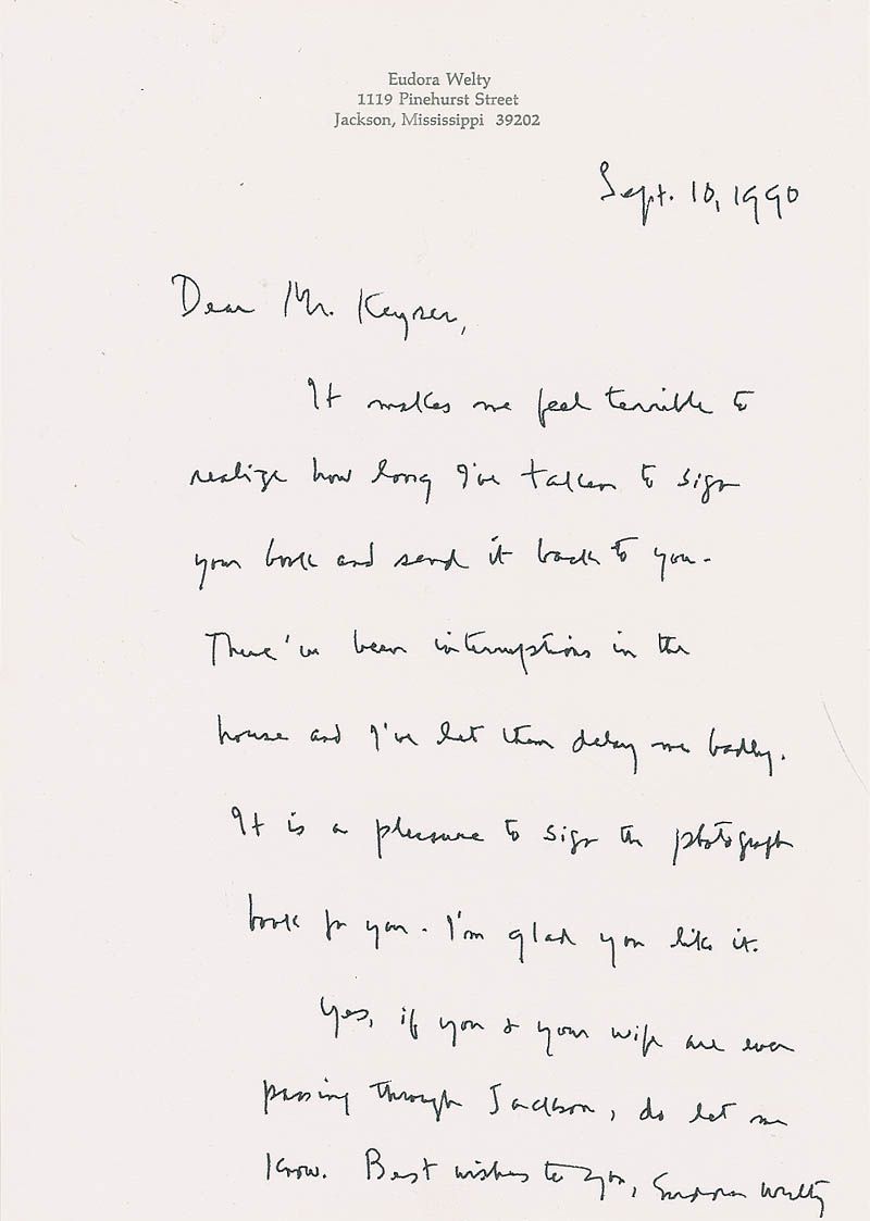 ALS, one page, 7.25 x 10, personal letterhead, September 10, 1990. Letter to an admirer. In part: “It makes me feel terrible to realize how long I’ve taken to sign your book and send it back to you. There’ve been interruptions in the house and I’ve let them delay me badly.” In fine condition.