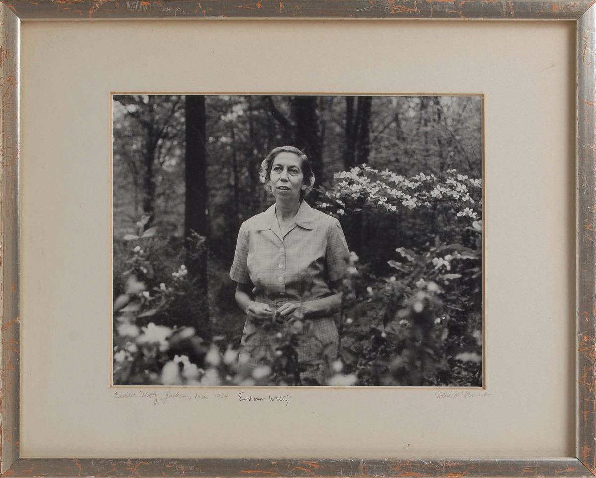 Vintage matte-finish 9 x 7.25 photo of Welty in a garden presented in its original 14 x 11 mat, titled and signed on the mat in pencil by the photographer, “Eudora Welty, Jackson, Miss., 1954, Rollie McKenna,” and signed in black ballpoint by the author, “Eudora Welty.” Framed and in fine condition.