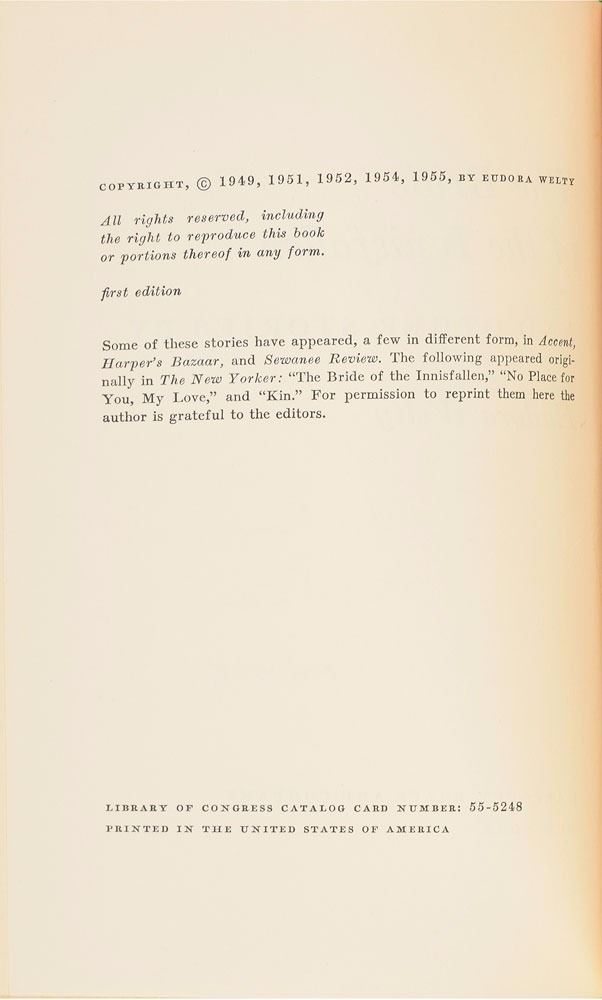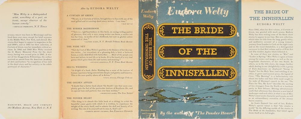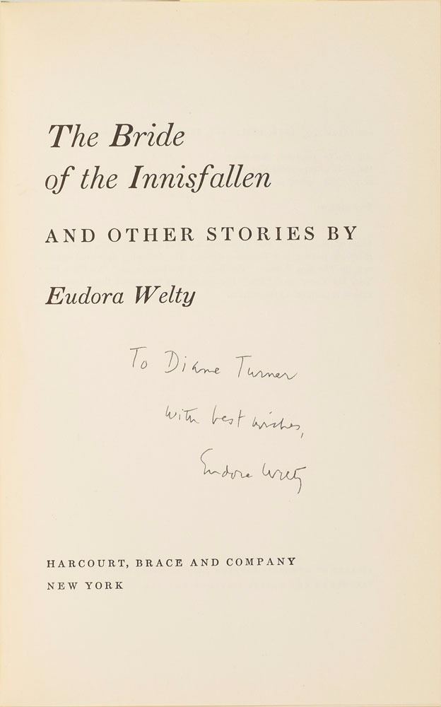Signed book: The Bride of the Innisfallen. First edition. NY: Harcourt, Brace and Company, 1955. Hardcover with dust jacket, 5.5 x 8.25, 207 pages. Signed and inscribed on the title page in black ink, "To Diane Turner, with best wishes, Eudora Welty." Autographic condition: fine. Book condition: VG+/VG-, with a price-clipped dust jacket affected by some chipping, paper loss, and biopredation.