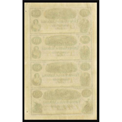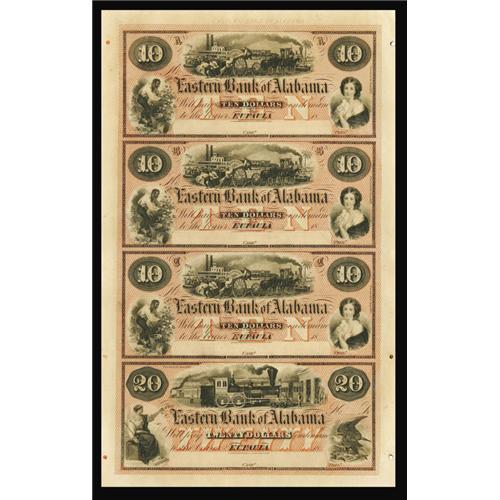 <B>Eufaula, AL - Eastern Bank of Alabama</B></I> $10-$10-$10-$20 Uncut Sheet G10b-G10b-G10b-G12b Rosene 68-8-68-8-68-8-68-9<BR>Here is a lovely red and black ABNCo sheet with detailed vignettes. Each note has a lateral fold. <B>Extremely Fine.</B></I>
