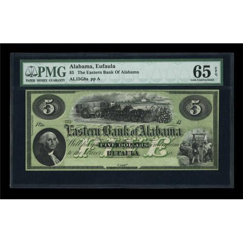<B>Eufaula, AL- The Eastern Bank of Alabama</B></I> $5 18__ G8a Rosene 68-5<BR> This well preserved $5 Remainder is adorned with antebellum vignettes. <B>PMG Gem Uncirculated 65 EPQ</B></I>.<BR><BR><b>Shipping:</b> Coins & Currency (<a target="_blank" href="http://www.heritageauctions.com/common/shipping.php">view shipping information</a>)