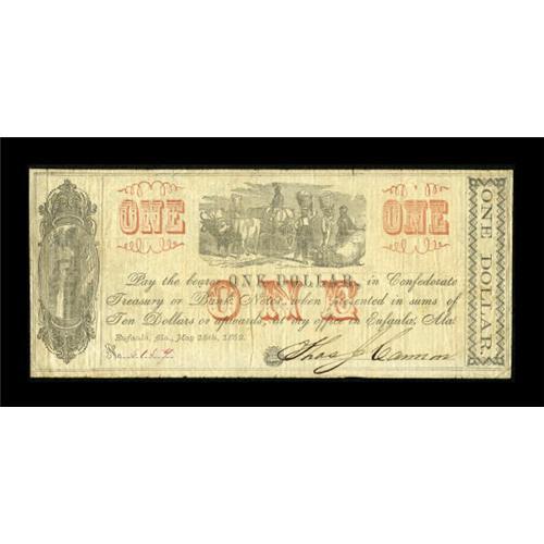 <B>Eufaula, AL- Thomas J. Cannon</B></I> $1 May 15, 1862 Rosene 66-2<BR> A rare piece of scrip which is in considerably nicer grade than the only similar example we've offered, which was the Rosene plate note sold as part of the Dr. Walter B. Jones collection in 2001. <B>Fine-Very Fine,</B></I> with a most evocative slavery central vignette. Ex-Memphis 2005 sale, lot 1565, where it realized $977.50 as part of the Schingoethe collection offering. <BR><I>From The Collection of a Louisiana Gentleman.</B></I><BR><BR><b>Shipping:</b> Coins & Currency (<a target="_blank" href="http://www.heritageauctions.com/common/shipping.php">view shipping information</a>)
