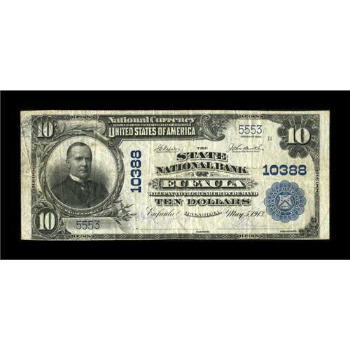 <B>Eufaula, OK</B></I> - $10 1902 Plain Back Fr. 630 <B>The State NB</B></I> Ch. # 10388<BR>While common in small size, large notes from here are another story entirely, with the census showing just six such examples. <B>Fine+,</B></I> rare enough to see bidding end in the vicinity of...<BR><BR><b>Shipping:</b> Coins & Currency (<a target="_blank" href="http://www.heritageauctions.com/common/shipping.php">view shipping information</a>)