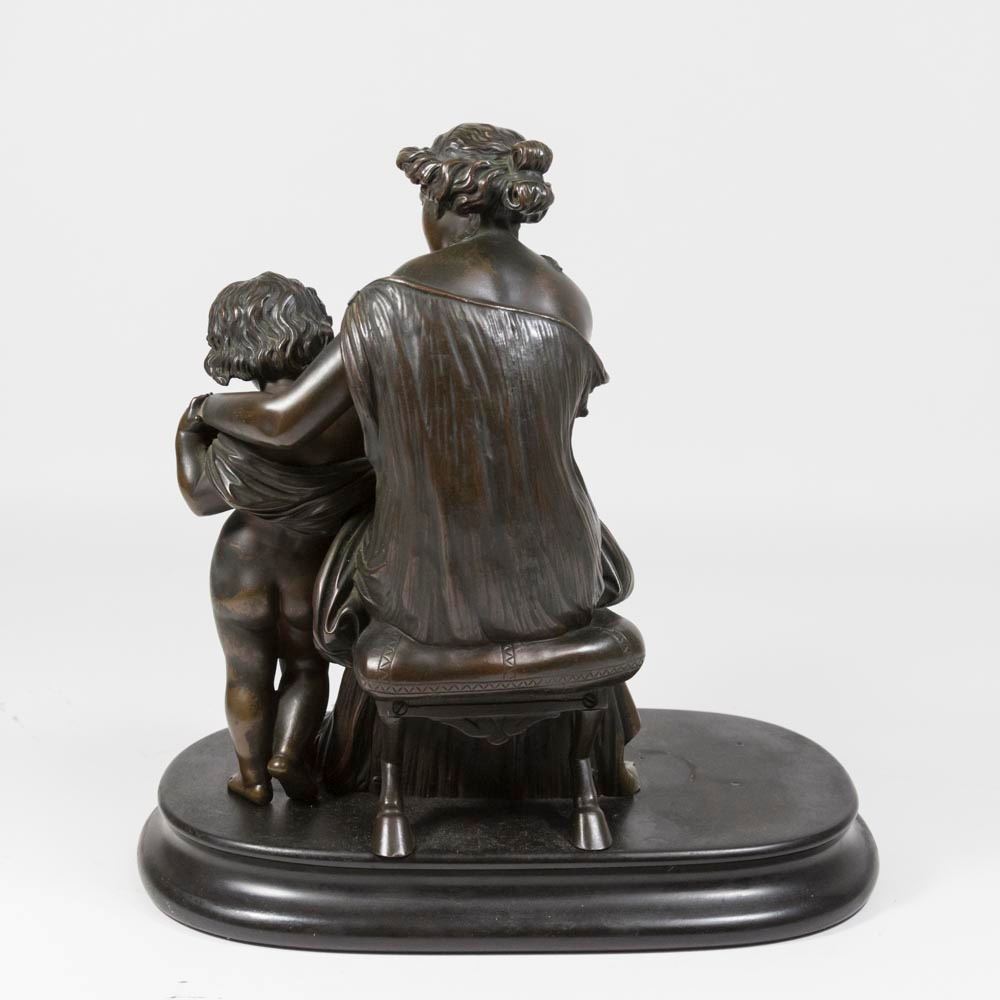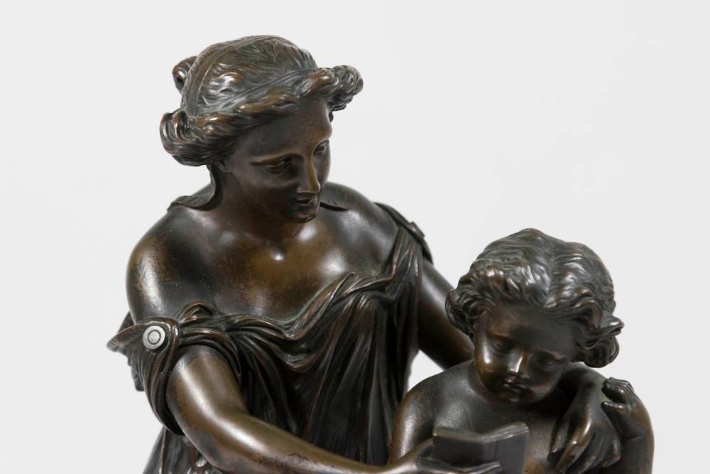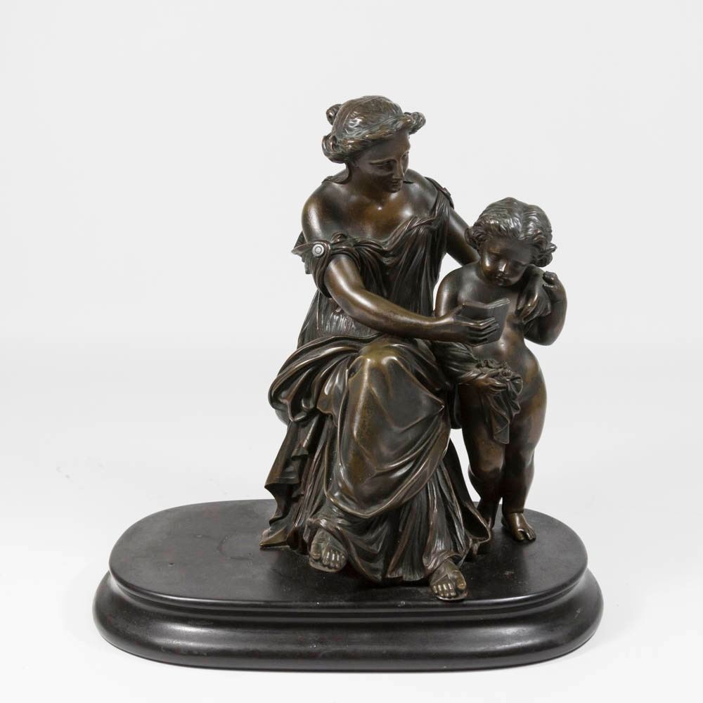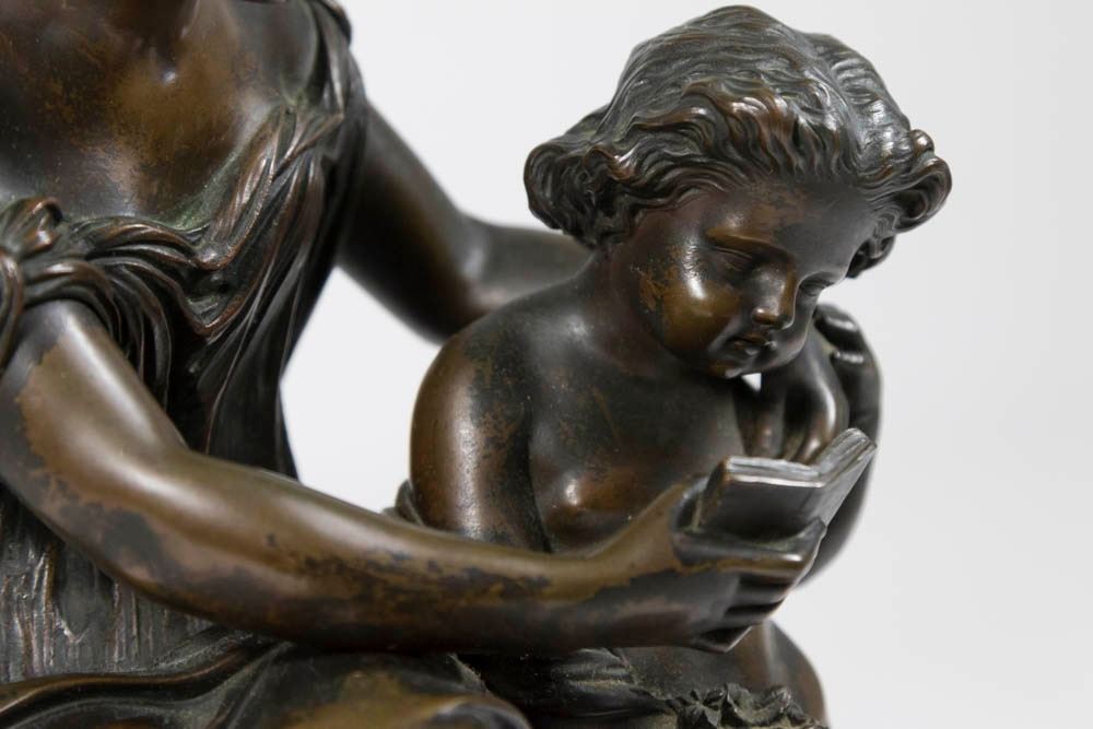 Bronze sculpture. Signed on side of chair. 19th century. Figure approx. 11" H. From a Florida gentleman's estate collection. Missing small table on side.