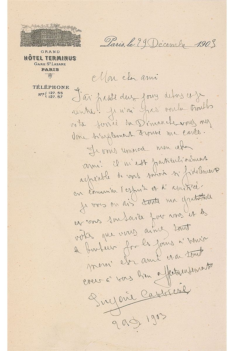 French symbolist painter (1849–1906) whose paintings are best known for their brown monochrome palette. ALS in French, one page, 5 x 8.25, Grand Hotel Terminus, Paris letterhead, December 29, 1903. Letter to a gentleman, whose friendship he declares to ch