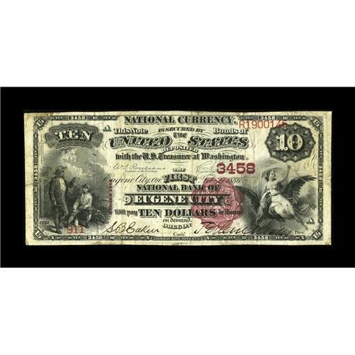 <B>Eugene City, OR</B></I> - $10 1882 Brown Back Fr. 482 <B>The First NB</B></I> Ch. # 3458<BR>The first title used here, which was used on Brown Backs only before being discontinued in 1906. Two notes are known with this nomenclature, with this the only one we've ever had for sale. Pen signed <B>Fine-Very Fine,</B></I> with a neat layout as a bonus.<BR><BR><b>Shipping:</b> Coin/Currency (<a target="_blank" href="http://www.heritageauctions.com/common/shipping.php">view shipping information</a>)