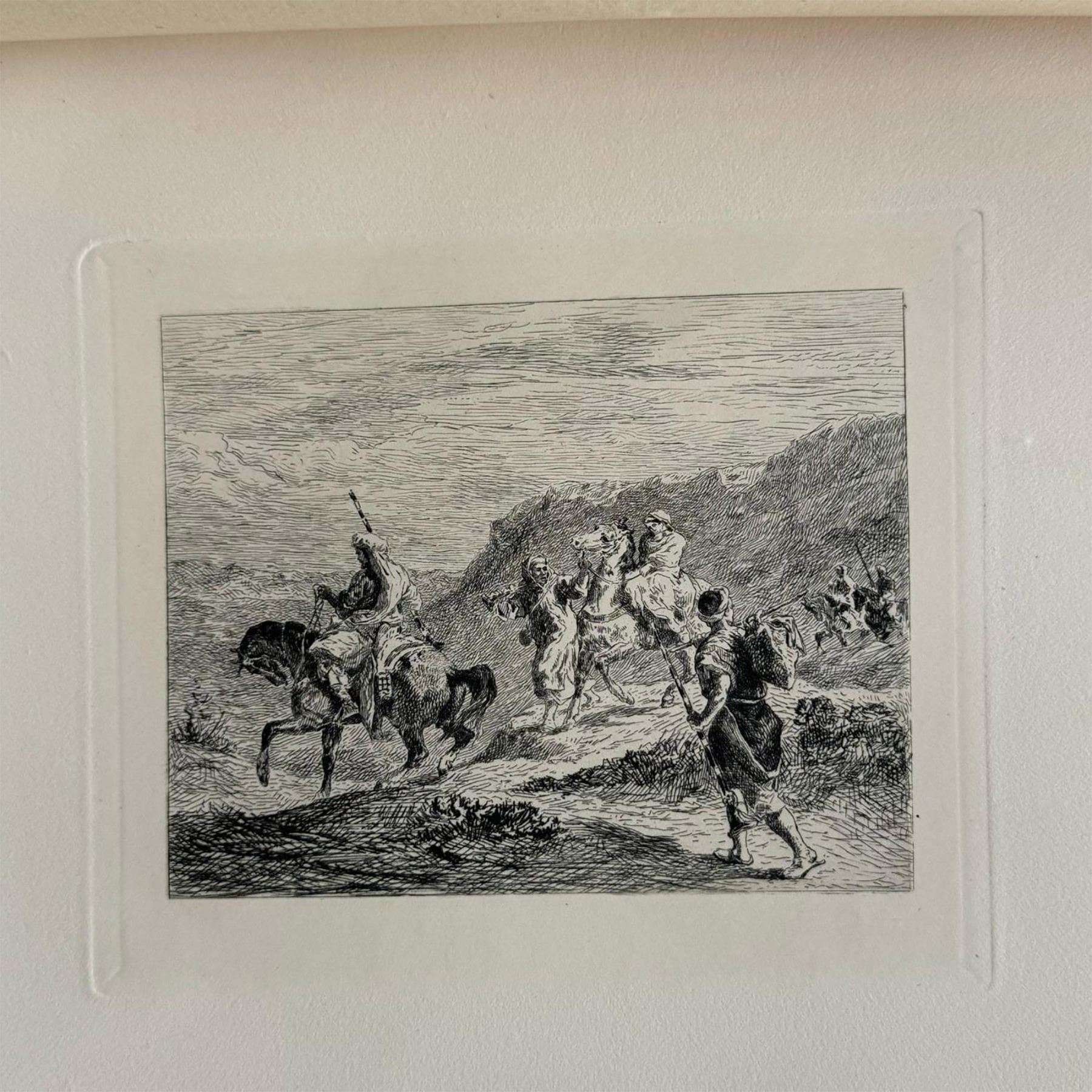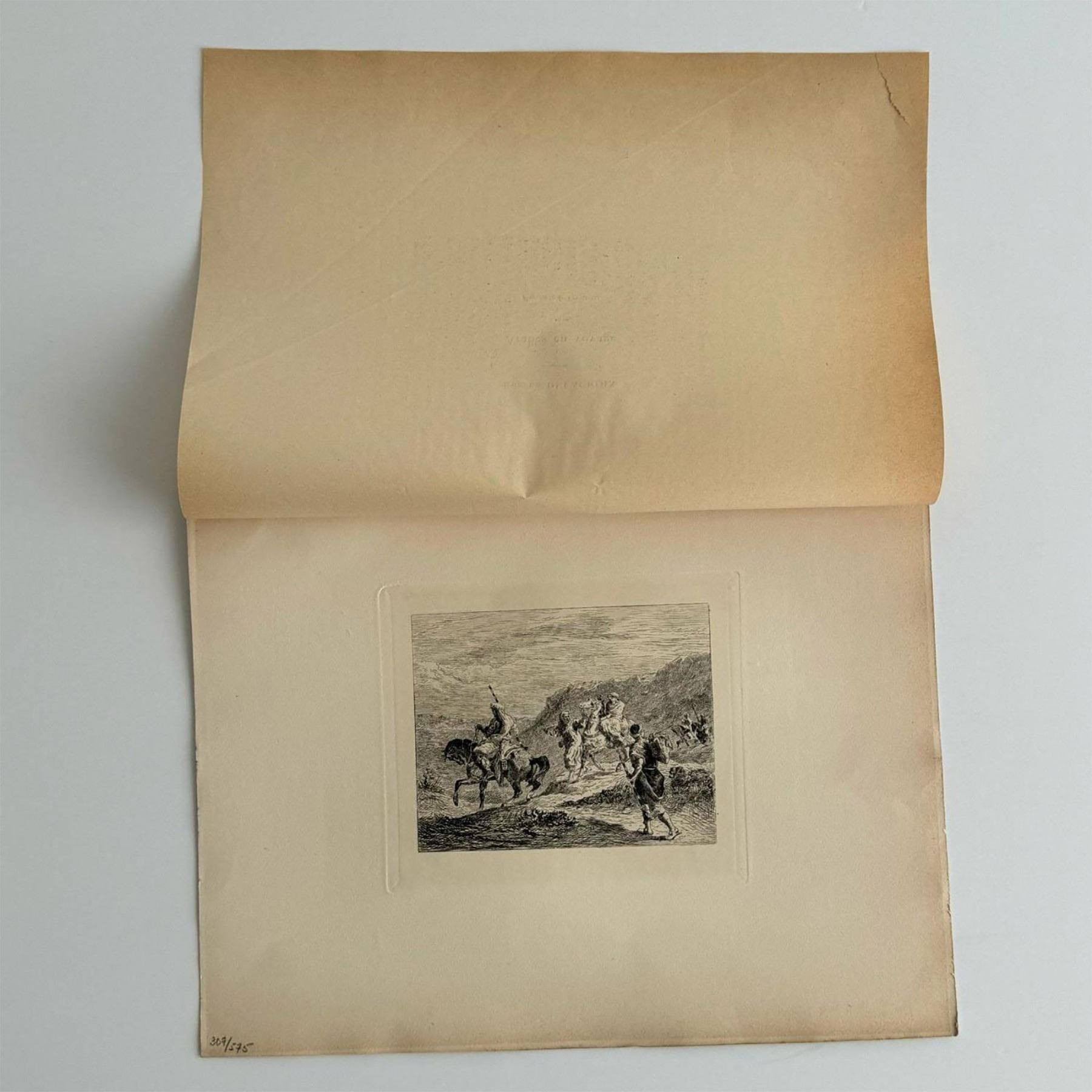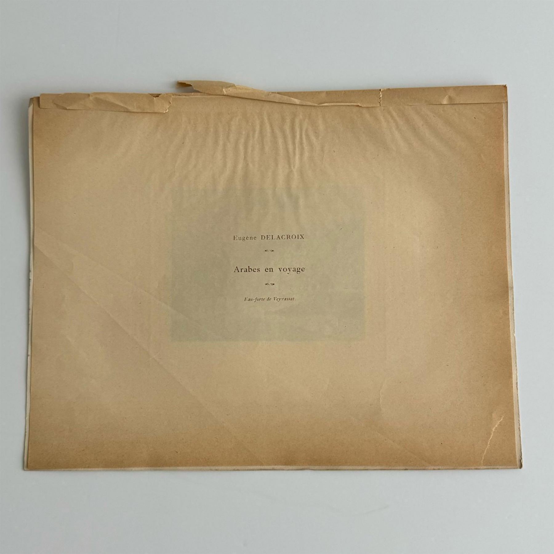 Antique etching on Marais wove paper entitled Traveling Arabs (Arabes en Voyage) after French Romantic artist Eugene Delacroix's original painting. Engraved by Master printmaker Jules Jacques Veyrassat for the rare limited edition portfolio Art et Nature by Leon Roger-Miles, published by Boudet, Librairie Artistique, Paris 1897. Edition number in graphite on lower left: 307/575. Includes protective cover sheet with artist's and engraver's name, and title in French.