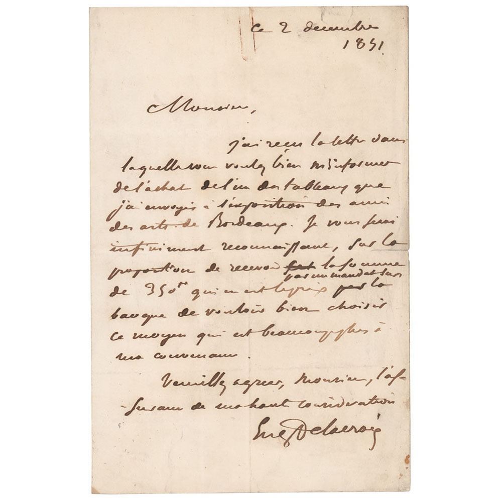 ALS in French, signed “Eug. Delacroix,†one page, 5.25 x 8, December 2, 1851. Untranslated letter to a gentleman referencing an art exhibition in Bordeaux. In very good to fine condition, with a rusty paperclip impression to the top edge, and a short split to the end of the central horizontal fold.
