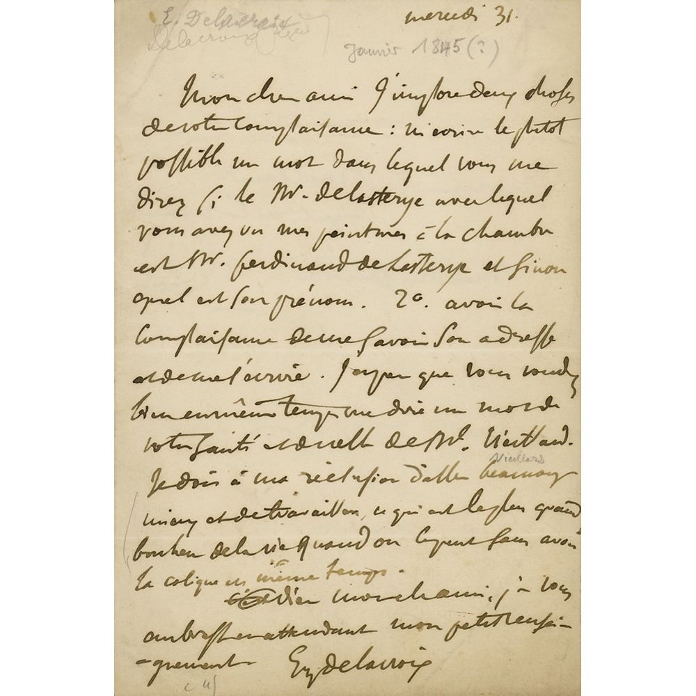 French artist (1798-1863) who takes a place in the first rank of painters in the Romantic tradition and whose mastery of color and technique inspired both the Impressionist and Symbolist schools. ALS in French, signed “Eug. Delacroix,” one page, 5 x 7.5, no date. Handwritten letter to Narcisse Vieillard, about his paintings at the French National Assembly. In part (translated): "I humbly request two things of your kindness: writing to me as soon as possible to tell me whether the Mr. de Lasterye with whom you have seen my paintings at the Assembly is Mr. Ferdinand de Lasterye and, should it not be the case, what his first name his. 2nd, please let me know his address and write it to me. I hope that, at the same time, you will be so kind as to tell me briefly about your health and Mrs. Vieillard’s health. Thanks to my seclusion, I am now much better and able to work, which is the greatest happiness of human life, provided one does not have colic at the same time." In fine condition.