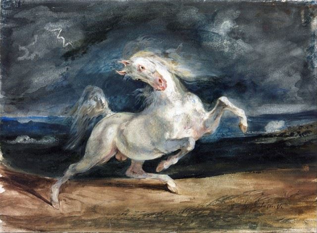 Artist: Eugene Delacroix - Title: Horse Frightened by Lightning - Medium: Fine Art Reproduction Giclee on Canvas - Image Size: Approximately 14.75 inches x 20 inches - Unframed on Unstretched Canvas - Biography: Ferdinand Victor Eugène Delacroix (26 April 1798 - 13 August 1863) was a French Romantic artist regarded from the outset of his career as the leader of the French Romantic school. - In contrast to the Neoclassical perfectionism of his chief rival Ingres, Delacroix took for his inspiration the art of Rubens and painters of the Venetian Renaissance, with an attendant emphasis on colour and movement rather than clarity of outline and carefully modelled form. Dramatic and romantic content characterized the central themes of his maturity, and led him not to the classical models of Greek and Roman art, but to travel in North Africa, in search of the exotic. Friend and spiritual heir to Theodore Gericault, Delacroix was also inspired by Lord Byron, with whom he shared a strong identification with the "forces of the sublime", of nature in often violent action.