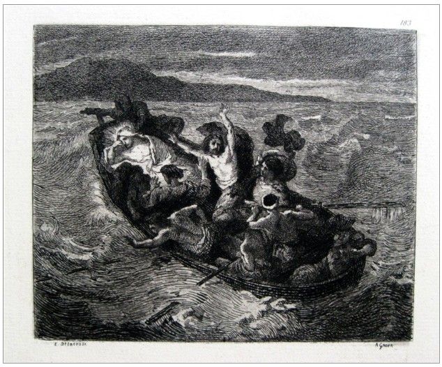 Eugene Delacroix "La Barque" Etching - Medium: etching (etched by Greux after the Delacroix painting). A nice impression on laid paper, published in Paris ca.1880. Plate size: 5 x 6 1/2 inches - Professionally Framed & Matted - Comes With Certificate - -