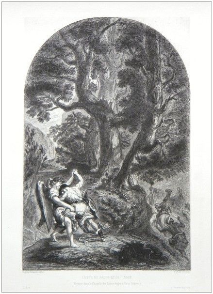 Eugene Delacroix "Lutte de Jacob et de l'Ange" Etching - Medium: etching (etched by Gustave Greux after the Delacroix painting). A nice impression on watermarked laid paper, published in Paris by L'Art, ca. the 1880's. Plate size: 12 1/2 x 7 5/8 inches (310 x 193mm) - Professionally Framed & Matted - Comes With Certificate - -