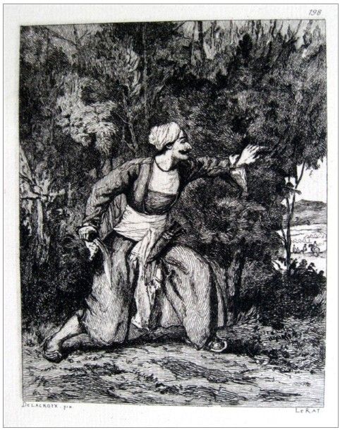 Eugene Delacroix "Un Indien en embuscade" Etching - Medium: etching (etched by Paul Larat after the Delacroix painting). A nice impression on laid paper, published in Paris ca.1880. Plate size: 6 1/2 x 5 inches - Professionally Framed & Matted - Comes With Certificate - -