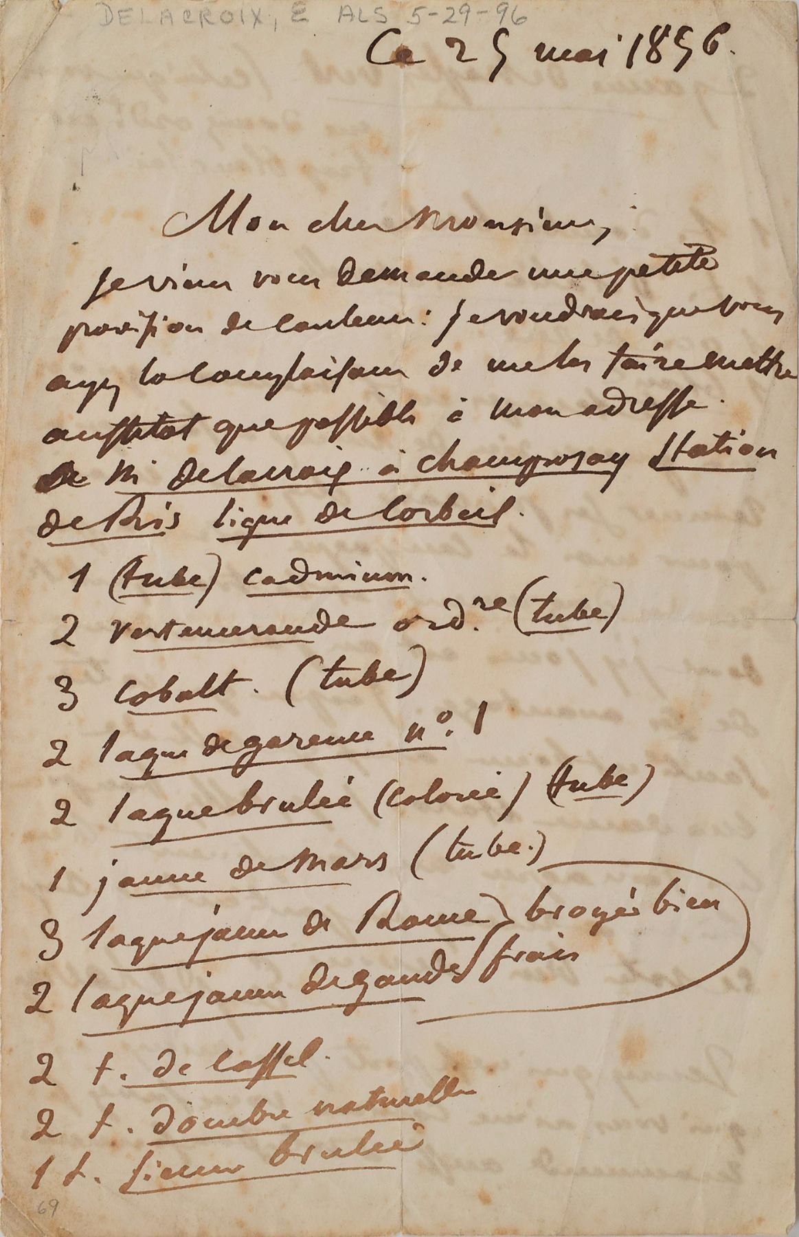 French artist (1798-1863) who takes a place in the first rank of painters in the Romantic tradition and whose mastery of color and technique inspired both the Impressionist and Symbolist schools. ALS in French, signed “Eug. Delacroix,” one page both sides, 5.25 x 8.25, May 29, 1856. A congenial, partially translated letter written by Delacrois while at Champrosay, in which he lists a detailed order of over 25 tubes of paints before offering a good-natured complaint about the weather, remarking "that there is hardly anything better to do than stir one's brushes at home, but for me the countryside is no less delightful and the peace I enjoy here is the foremost of its advantages." In very good condition, with light foxing and staining, and writing showing through from opposing sides. Champrosay was a country retreat at the edge of the Forest of Senart that served as the subject of some of Delacroix's few pure landscape paintings.