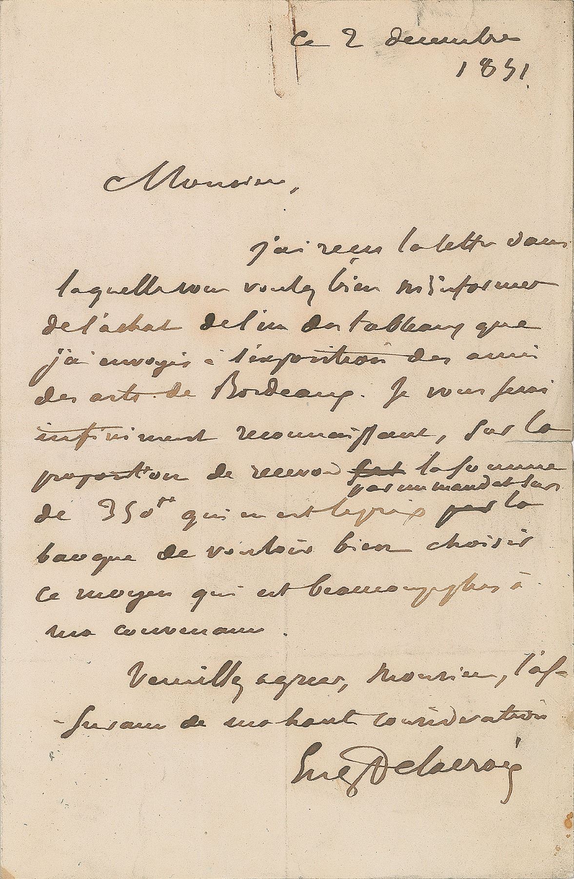 French artist (1798–1863) who takes a place in the first rank of painters in the Romantic tradition and whose mastery of color and technique inspired both the Impressionist and Symbolist schools. ALS in French, signed “Eug. Delacroix,” one page, 5.25 x 8, December 2, 1851. Letter to a gentleman arranging for the payment for one of his masterworks exhibited in Bordeaux in 1851. In full (translated): "I have received the letter in which you kindly let me know that you have bought one of the paintings that I have sent to the exhibition of the Friends of Arts in Bordeaux. I would be grateful to you if you could indeed chose the bank order for the payment of 350 francs, which is the price of my work. This payment method is much more convenient to me than the other ones." In very good to fine condition, with a rusty paperclip impression to the top edge, and a short split to one of the intersecting folds. Delacroix sent three of his paintings to be exhibited at Bordeaux for the first annual Exposition de la Société des Amis des Arts in 1851, including the masterpiece 'Le Christ au Jardin des Oliviers [Christ in the Garden of Olives]' which was indeed sold for 350 francs. It is also interesting to note that this letter was written on the same day that Napoleon III organized his coup d'etat.