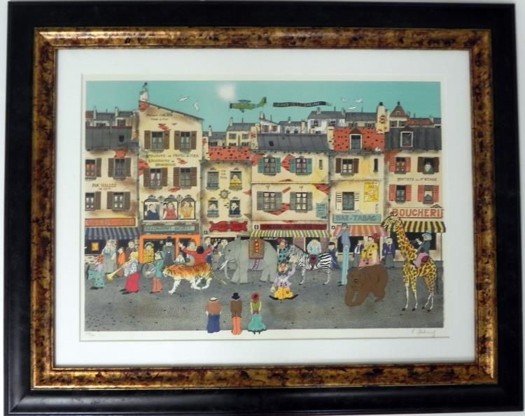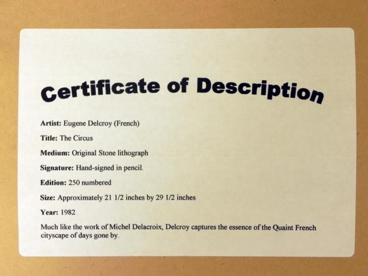 Artist: Eugene DelcroyTitle: The CircusMedium: Original Stone LithographSignature: In pencil, lower right cornerEdition: 223/250, in pencil lower left cornerImage size: 21 1/2" x 29 1/2"Frame size: 30" x 37 1/2"Certificate of Authenticity: Included, on backCondition: Very good; some slight chiping to edge of frame