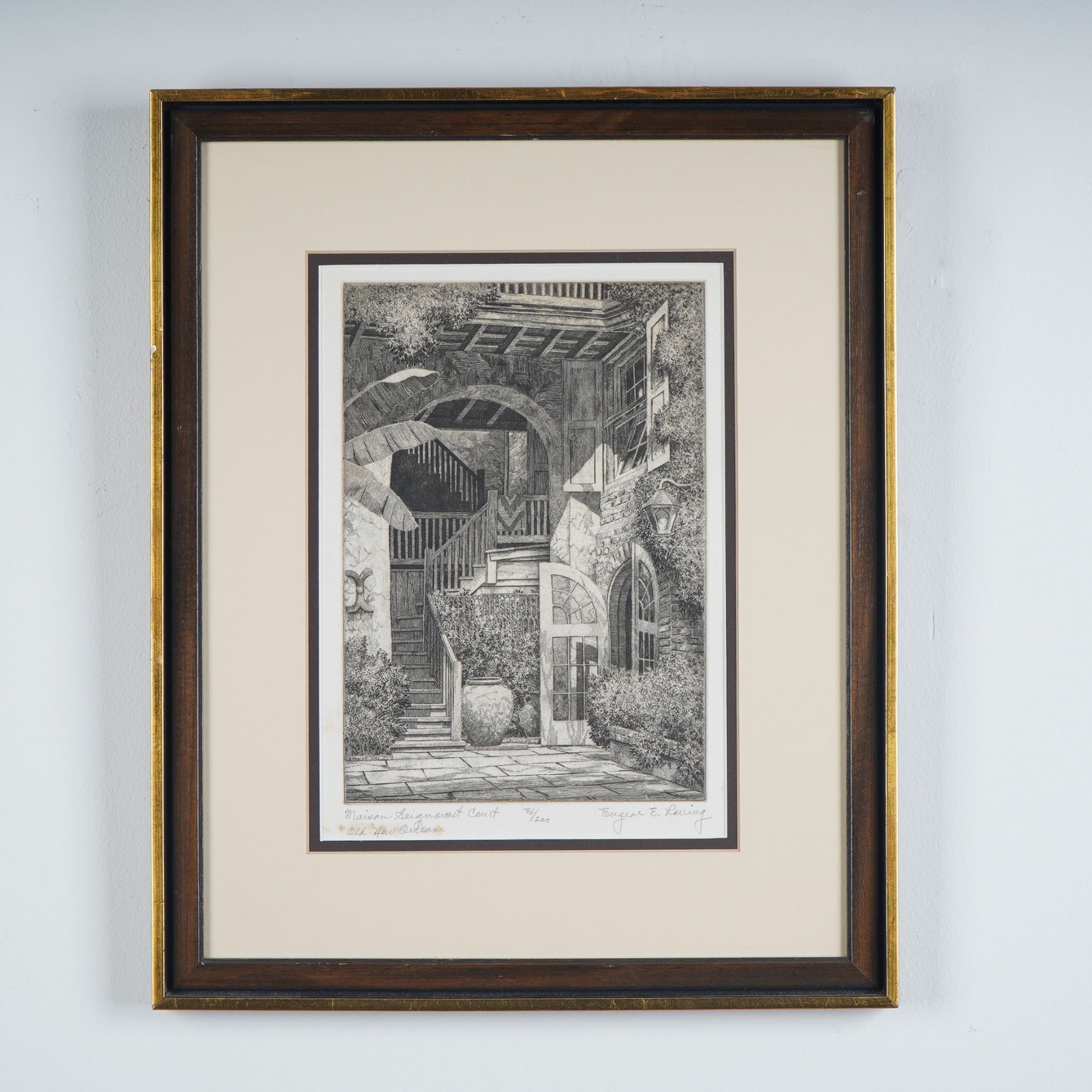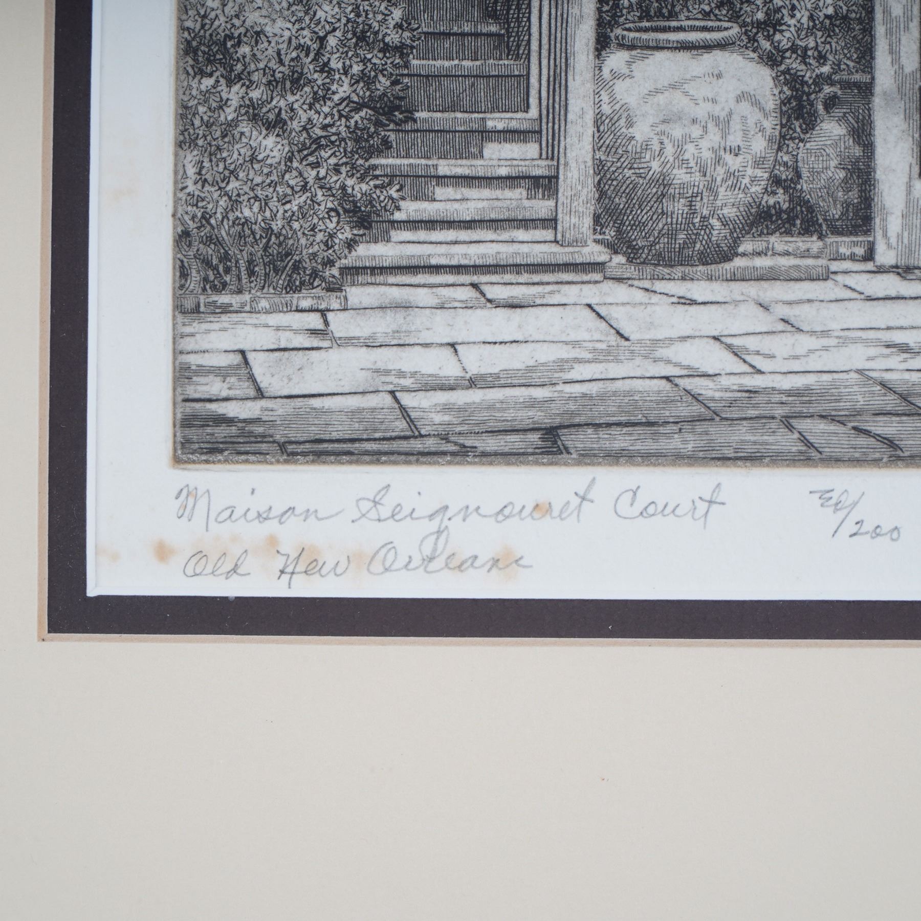 This framed limited edition etching by American artist Eugene E. Loving captures the timeless charm of Maison Seignouret Court in Old New Orleans. The intricate architectural composition reveals a sun-dappled courtyard rich with wrought iron details, stone textures, and foliage. Eugene E. Loving was an American printmaker and illustrator known for his finely detailed etchings of historical architecture, especially scenes from Louisiana and the American South. His work often focused on iconic structures, preserving their character through masterful use of line and shadow. Loving was active during the mid-20th century and exhibited regionally, gaining recognition for his contributions to American architectural art. Signed by the artist in pencil at lower right, the piece is titled in pencil at lower left and numbered ED/200, indicating it is an edition of 200. Housed in a double mat and wood frame with gilt edge.
