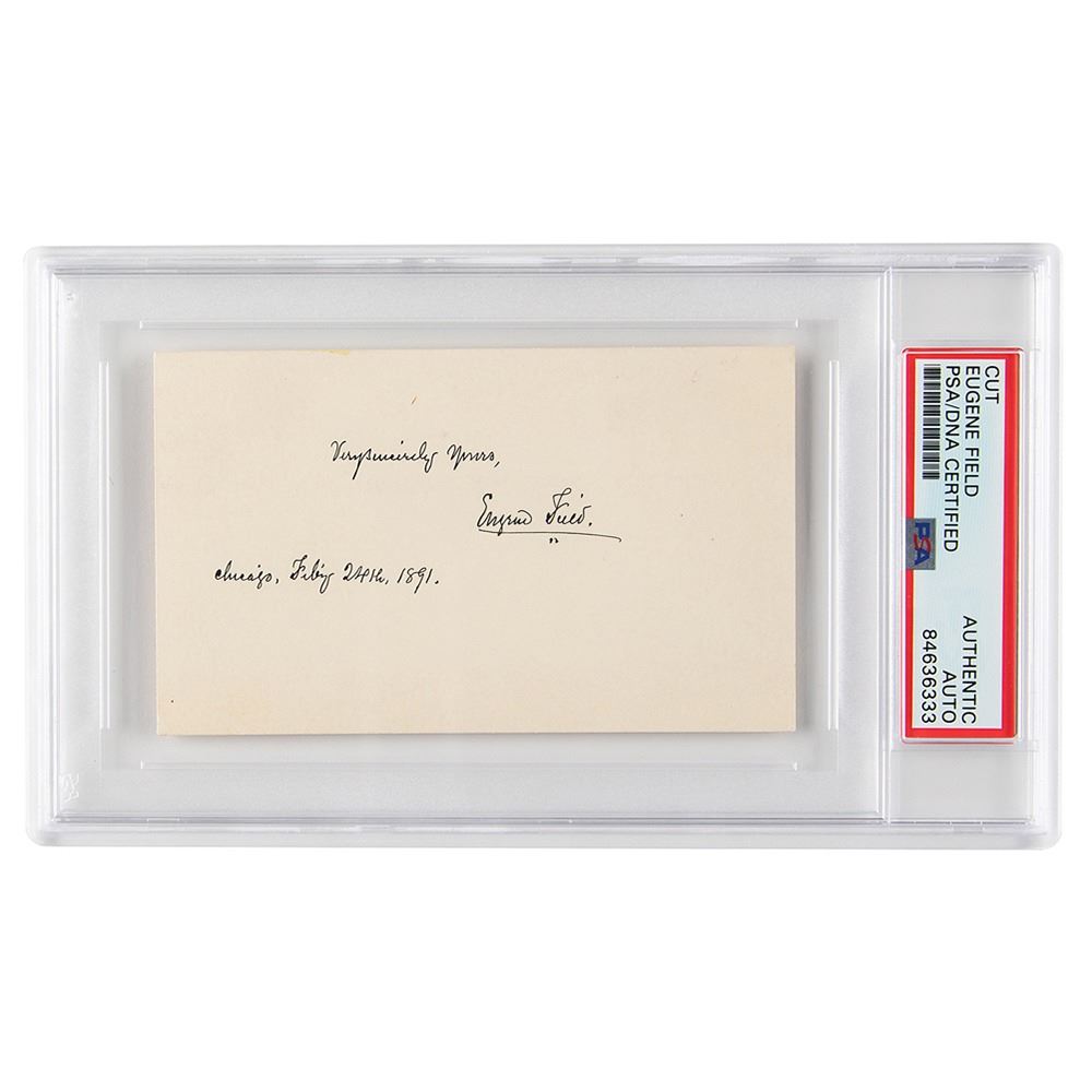 Ink signature, "Very sincerely yours, Eugene Field, Chicago, Feb& #39;y 24th 1891,& rdquo; on an off-white 4.5 x 2.75 card. In very fine condition. Encapsulated in a PSA/DNA authentication holder.
