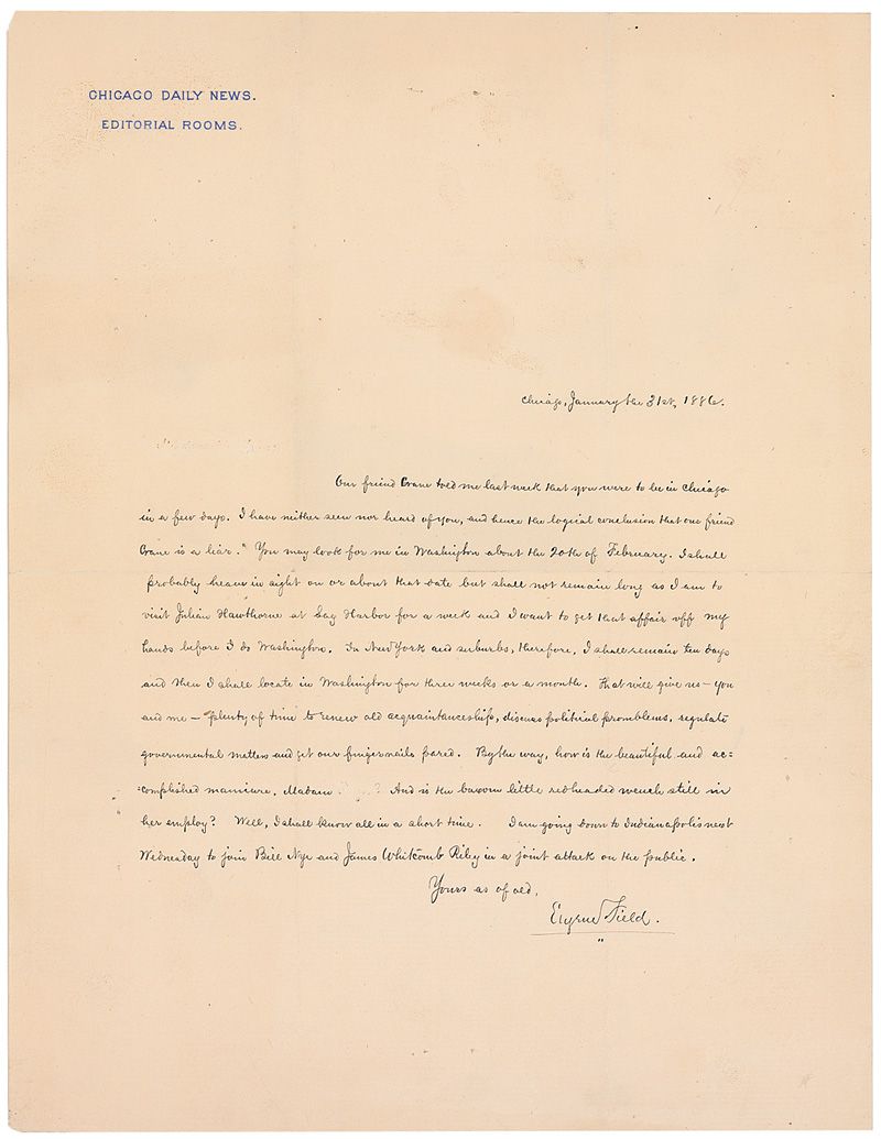 American writer (1850–1895) best known for his poems of childhood, including ‘Wynken, Blynken, and Nod’ and ‘Little Boy Blue.’ ALS, one page, 8.5 x 11, Chicago Daily News letterhead, January 31, 1886. Letter to an unidentified recipient. In part: “I have neither seen nor heard of you, and hence the logical conclusion that our friend Crane is a liar…I am to visit Julian Hawthorne at Sag Harbor for about a week…In New York and suburbs, therefore, I shall remain ten days…That will give us-you and me-plenty of time to renew old acquaintances, discuss political problems, regulate governmental matters and get our fingernails pared. By the way, how is the beautiful and accomplished manicure Madame…Is the buxom little redheaded wench still in her employ?…I am going down to Indianapolis next Wednesday to join Bill Nye and James Whitcomb Riley in a joint attack on the public.” In very good condition, with intersecting folds, one through a single letter of signature, several staple holes, scattered light toning, and recipient's and manicurist’s name scratched off.