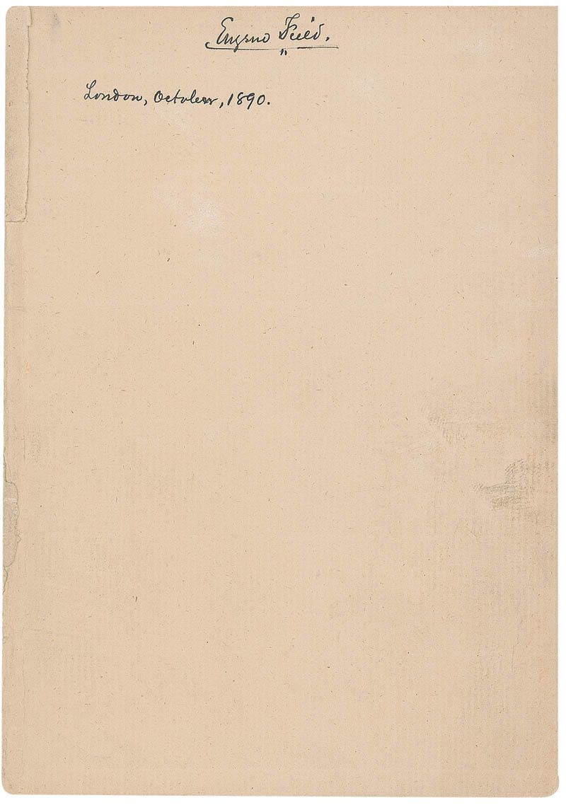 Ink signature, “Eugene Field. London, October, 1890,” on an off-white 4.5 x 6.5 sheet likely removed from one of his books. Light scattered toning, soiling, and creases, otherwise fine condition.
