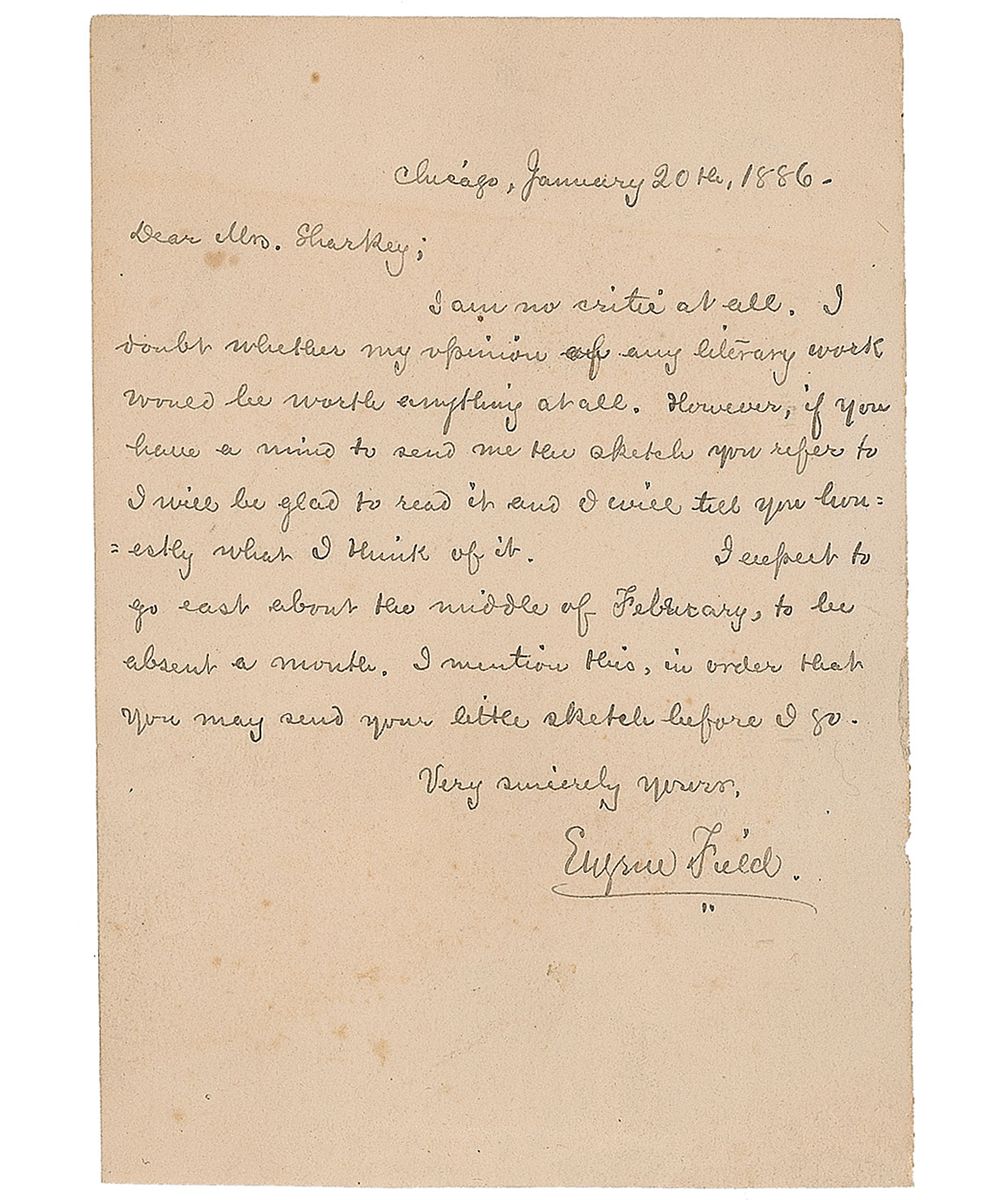 American writer (1850–1895) best known for his poems of childhood, including ‘Wynken, Blynken, and Nod’ and ‘Little Boy Blue.’ Miniscule ALS, one page, 2.75 x 4, January 20, 1886. Letter to a woman reads, in part, “I am no critic at all. I doubt whether my opinion of any literary work would be worth anything at all. However, if you have a mind to send me the sketch you refer to I will be glad to read it and will tell you honestly what I think of it.” In fine condition.