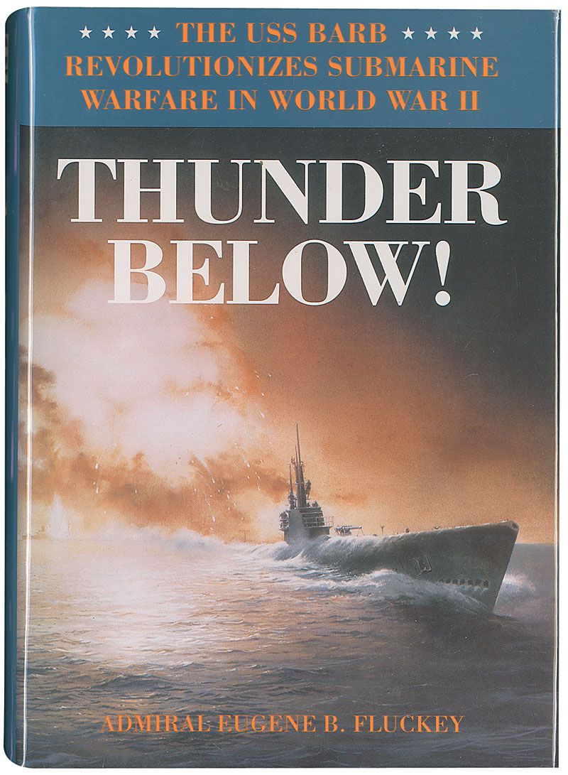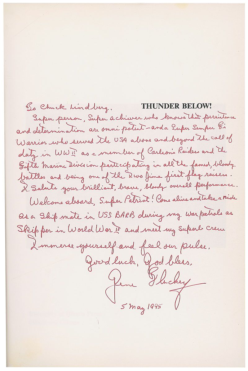 Signed book: Thunder Below! Urbana and Chicago: University of Illinois Press, 1992. Hardcover with dust jacket, 7.5 x 10.25, 444 pages. Signed with a lengthy inscription to Iwo Jima flag raiser Charles W. Lindberg in red ballpoint on the half-title page. In part: “To Chuck Lindberg…a Super Semper Fi Warrior who served the USA above and beyond the call of duty in WWII as a member of Carlsons Raiders and the Fifth Marine Division participating in all the famed, bloody battles and being one of the Iwo Jima first flag raisers.” In fine condition.