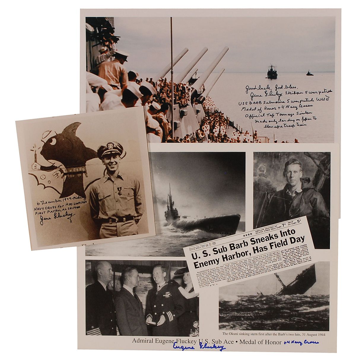 Three photos: color glossy 10 x 8 photo of the Japanese surrender, signed in black felt tip, “Good luck, God bless. Gene Fluckey, Skipper & War patriot. USS Barb submarine 5 war patrols WW II, Medal of Honor & 4 Navy Crosses, Official top tonnage sinker, made only landing on Japan to blow up a troop train”; 10 x 8 composite cardstock photo, signed in blue felt tip; and a satin-finish 5 x 5 photo of Fluckey on his submarine, signed in black felt tip. In fine condition.