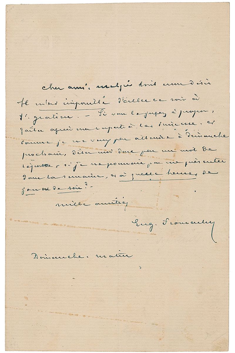 French painter, writer, and art critic (1820–1876) best known for his early paintings of Algeria, and the famous novel Dominique. Untranslated ALS in French, signed “Eug. Fromentin,” one page, 5 x 8, blindstamped personal letterhead, no date. In very good condition, with central vertical and horizontal folds and various thin lines of staining (passing through some of the text).