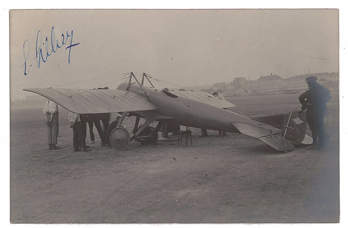 French racing pilot and WWI flying ace credited with five aerial victories (1889–1918) who was killed in a test flight crash. Scarce matte-finish 5.5 x 3.5 real photo postcard of an early plane, neatly signed in blue ink "E. Gilbert.” In fine condition.