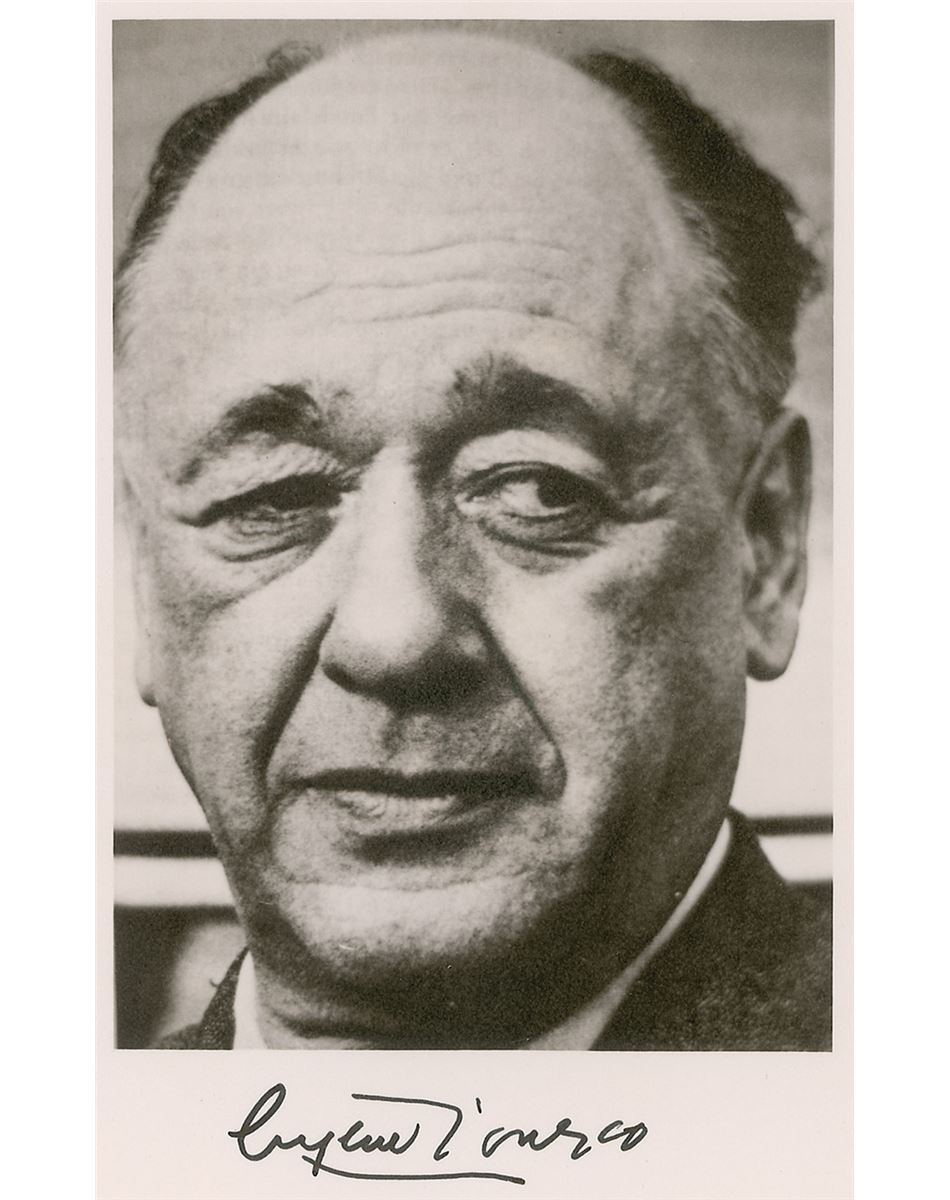 Distinguished Romanian-born playwright (1909–1994) best known as a leading figure in the ‘Theatre of the Absurd.’ Matte-finish 3.5 x 5.5 portrait of Ionesco, signed in the lower border in black felt tip. In very fine condition.