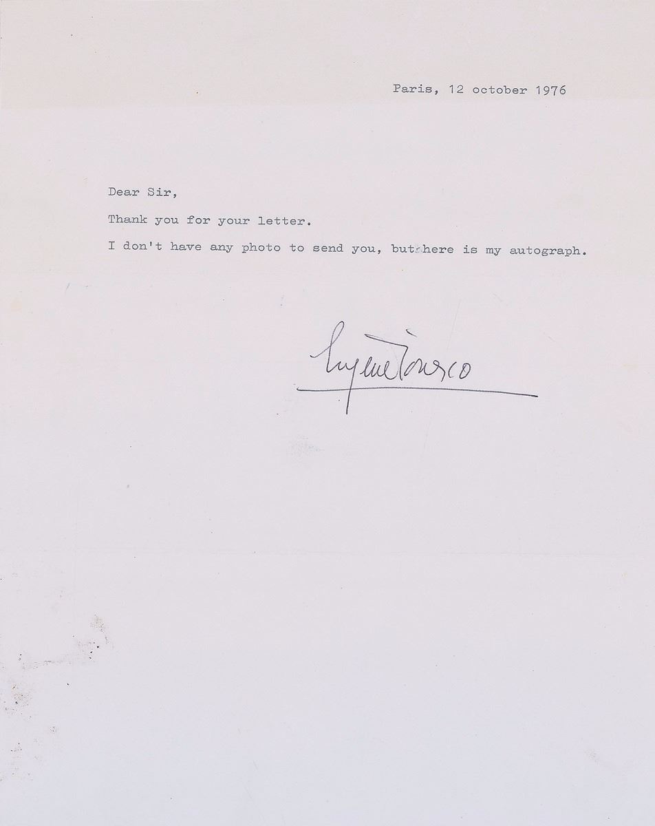 TNS, one onionskin page, 8.25 x 10.25, Paris, October 12, 1976. Note to an unidentified gentleman, in full: “Thank you for your letter. I don’t have any photo to send you, but here is my autograph.” In fine condition, with slight soiling to lower left and several horizontal folds (one passing through the signature).