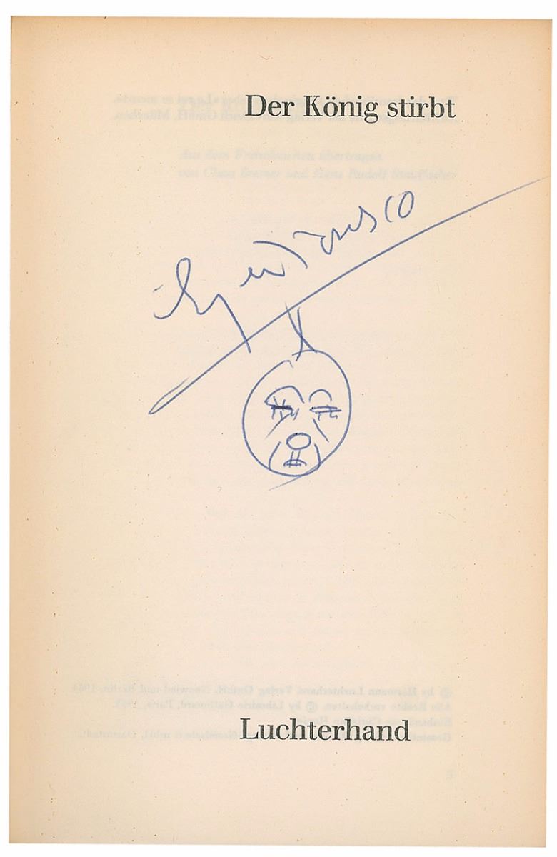 Signed book: Der Konig stirbt (Exit the King) in German. Later printing. Berlin: Luchterhand, 1964. Softcover, 5.5 x 8, 62 pages. Signed on the half-title page in blue ballpoint, with Ionesco adding a small sketch of the face of a sad clown. In fine condition.