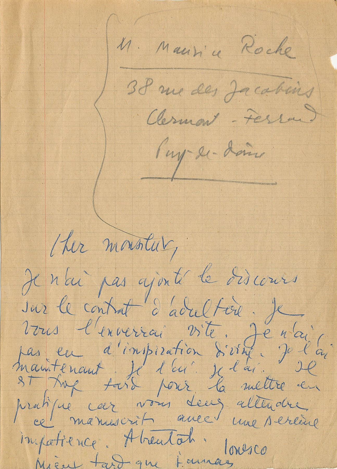Distinguished Romanian-born playwright (1909–1994) best known as a leading figure in the 'Theatre of the Absurd.' Untranslated ALS in French, signed “Ionesco,” one page, 6 x 8.5, no date. In fine condition, with scattered light creasing and a small chip to the right edge.