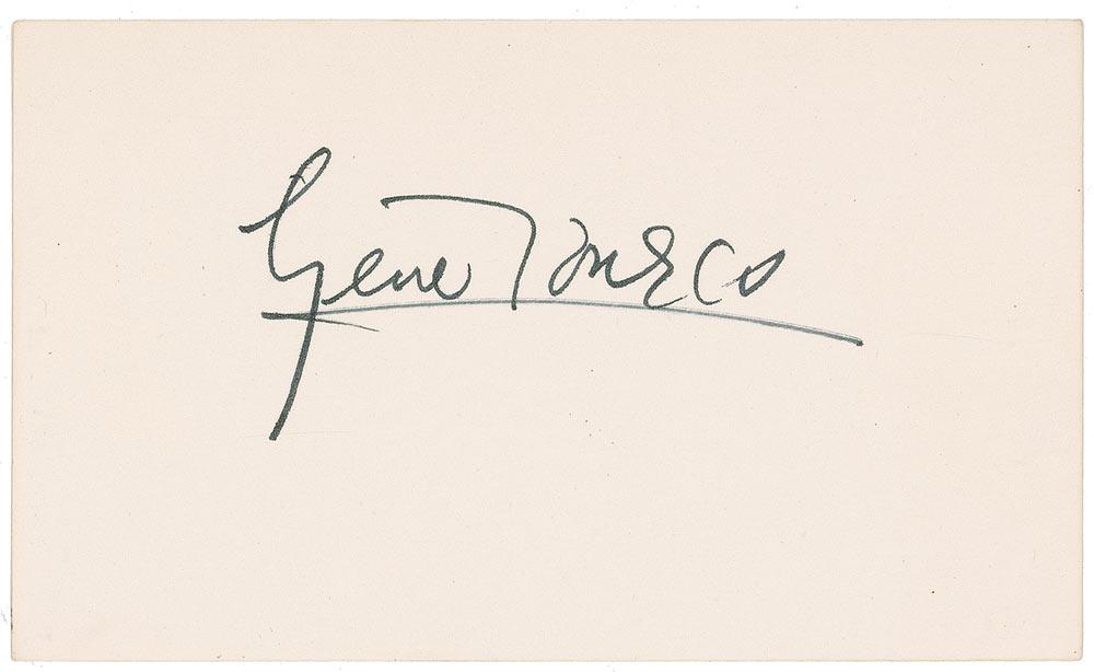 Distinguished Romanian-born playwright (1909–1994) best known as a leading figure in the ‘Theatre of the Absurd.’ Felt tip signature, “Gene Ionesco,” on a white 5 x 3 card. In fine condition.